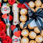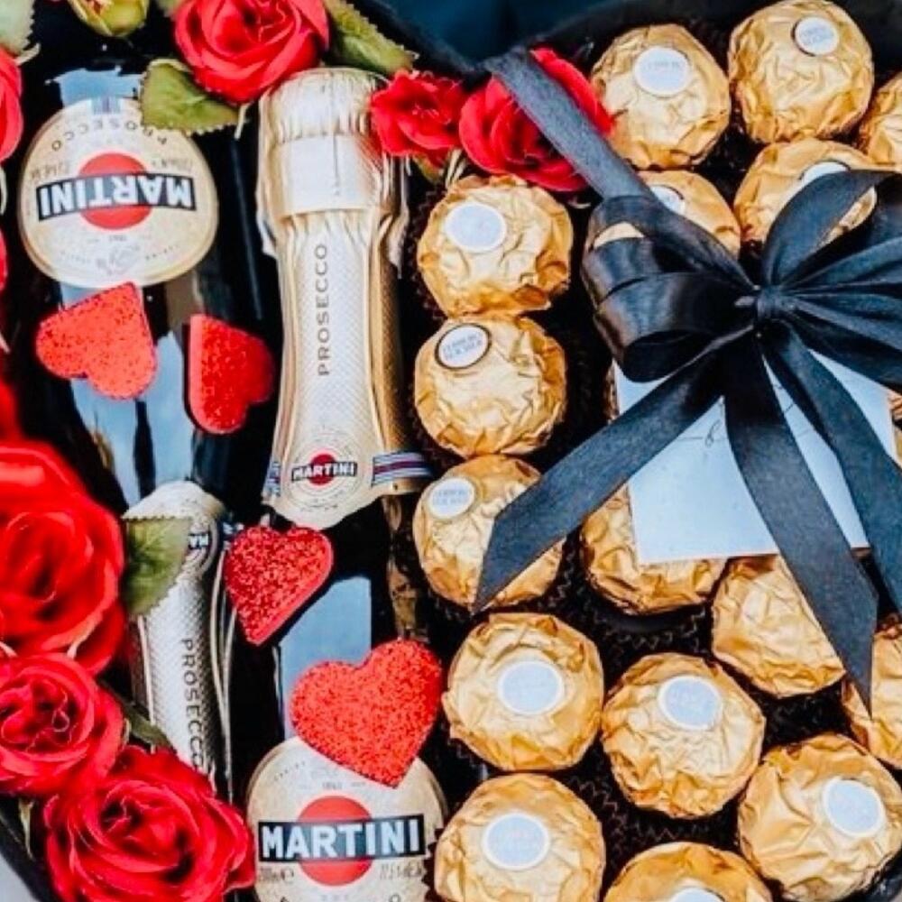 Подарочный набор в форме сердца, который не оставит равнодушным никого. В набор входят: • 2 бутылки изысканного Prosecco Martini 0,2л • 20 конфет Ferrero Rocher в золотистых обертках • Украшение из свежих красных роз и декоративных элементов Этот великолепный набор станет идеальным подарком для особого случая - будь то День Святого Валентина, годовщина или просто знак внимания для любимого человека. Порадуйте своих близких стильным и изысканным подарком, который сочетает в себе сладость и элегантность.