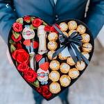 Коробка в виде сердца - 1 db. Ferrero rocher - 20 db. розы красные - 10 db. martini prosecco - 2 db.