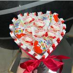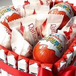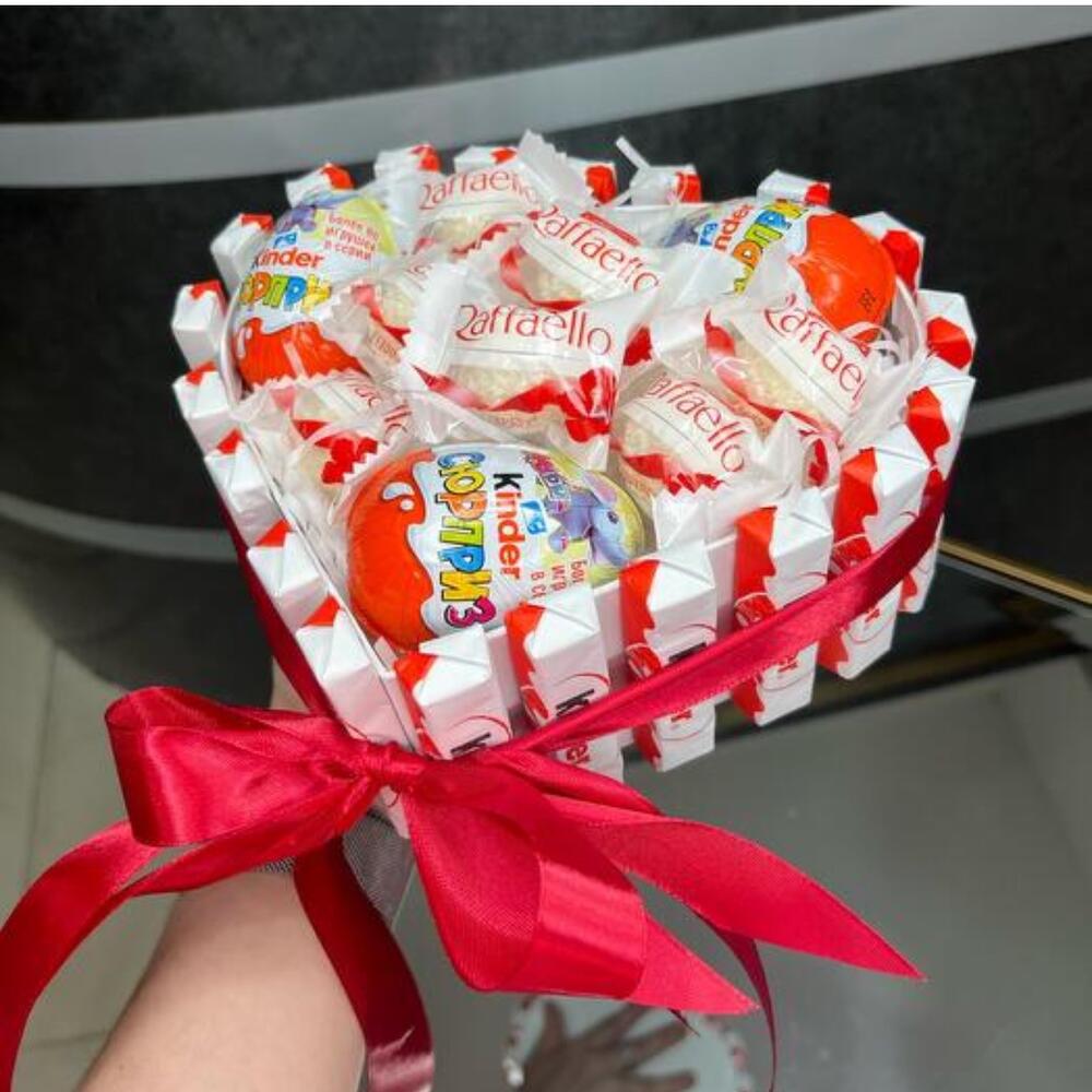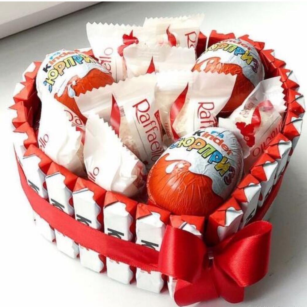 Раффаэлло - 7 db. Szatén szalag - 1 db. Коробка сердце - 1 db. Киндер шоколад - 20 db. Киндер яйцо - 3 db.
