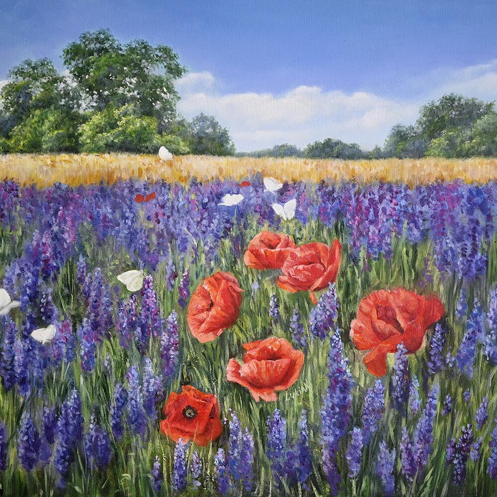 Tehnika: Ulje na platnu zategnutom na drveni podokvir. Dimenzije: 50x70 cm. Ekskluzivnost: Ovo je originalno i unikatno umetničko delo. Ne postoje kopije niti ponovljene verzije slike. Stil: Vibrantni savremeni spoj akademskog realizma i impresionizma. Kompozicija verno prenosi vazdušastu atmosferu letnjeg dana, sa nežnim makovima i leptirima u polju lavande. Oprema: Slika se prodaje bez rama (neuramljena). Ivice su uredno obrađene, što omogućava moderno izlaganje sa ramom ili bez njega. O autoru: Rad diplomirane umetnice Akademije umetnosti Ilija Repin u Sankt Peterburgu.