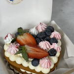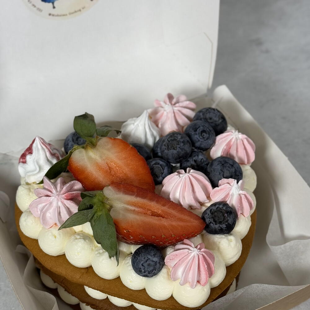 An open-style heart-shaped bento Medovik cake made with thin layers of honey sponge, delicately covered with smooth buttercream. Decorated with fresh berries, this cake is light, aromatic, and perfectly balanced between sweetness and creaminess. A cozy yet elegant dessert, ideal for a romantic treat or a special occasion.