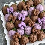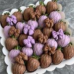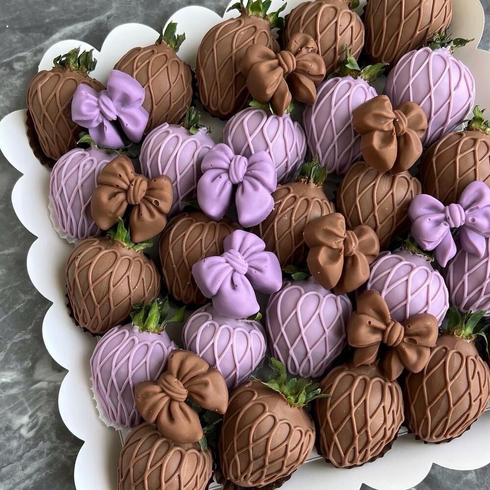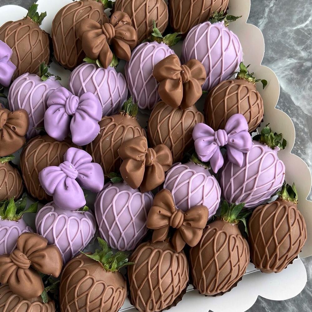 Selected strawberries in Belgian milk chocolate - 15 pieces. Selected strawberries in lilac Belgian chocolate - 15 pieces. Chocolate bow candies - 10 pieces. White box with transparent lid - 1 piece.