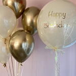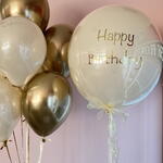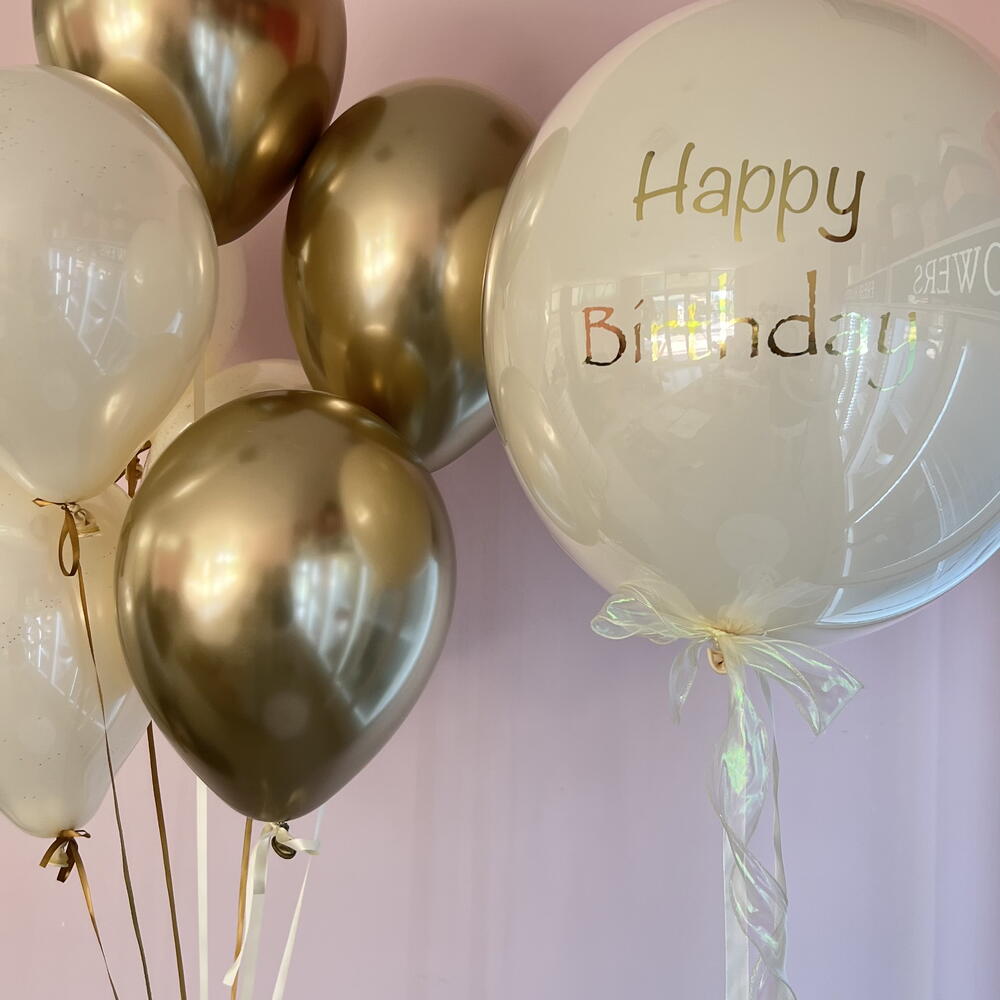 Grande pallone di vetro Happy Birthday e mix di palloncini oro e crema