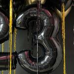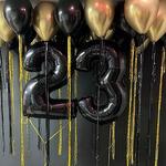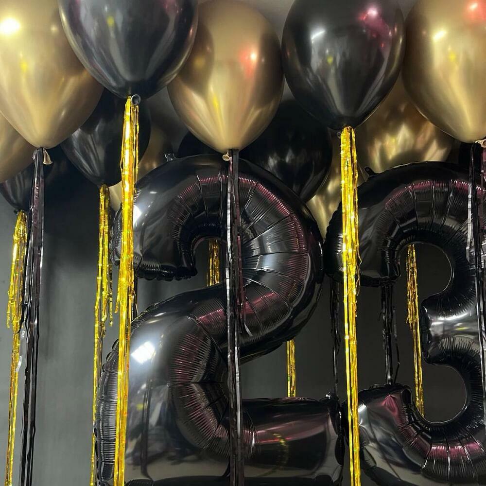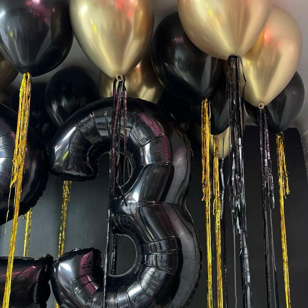 Шары под потолок и черные цифр. С дождиком, хром золото и черные, на день рождения для мужчин