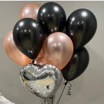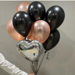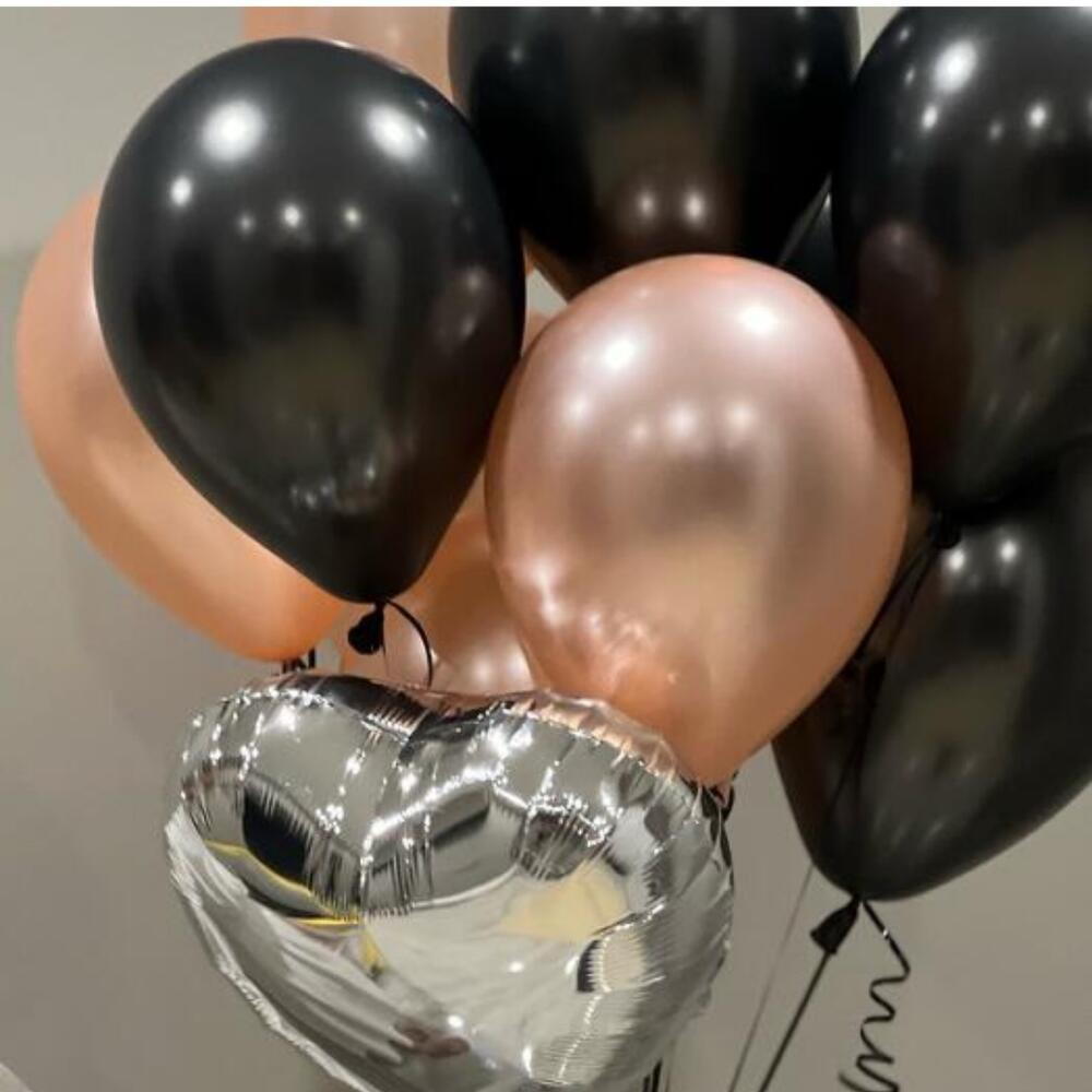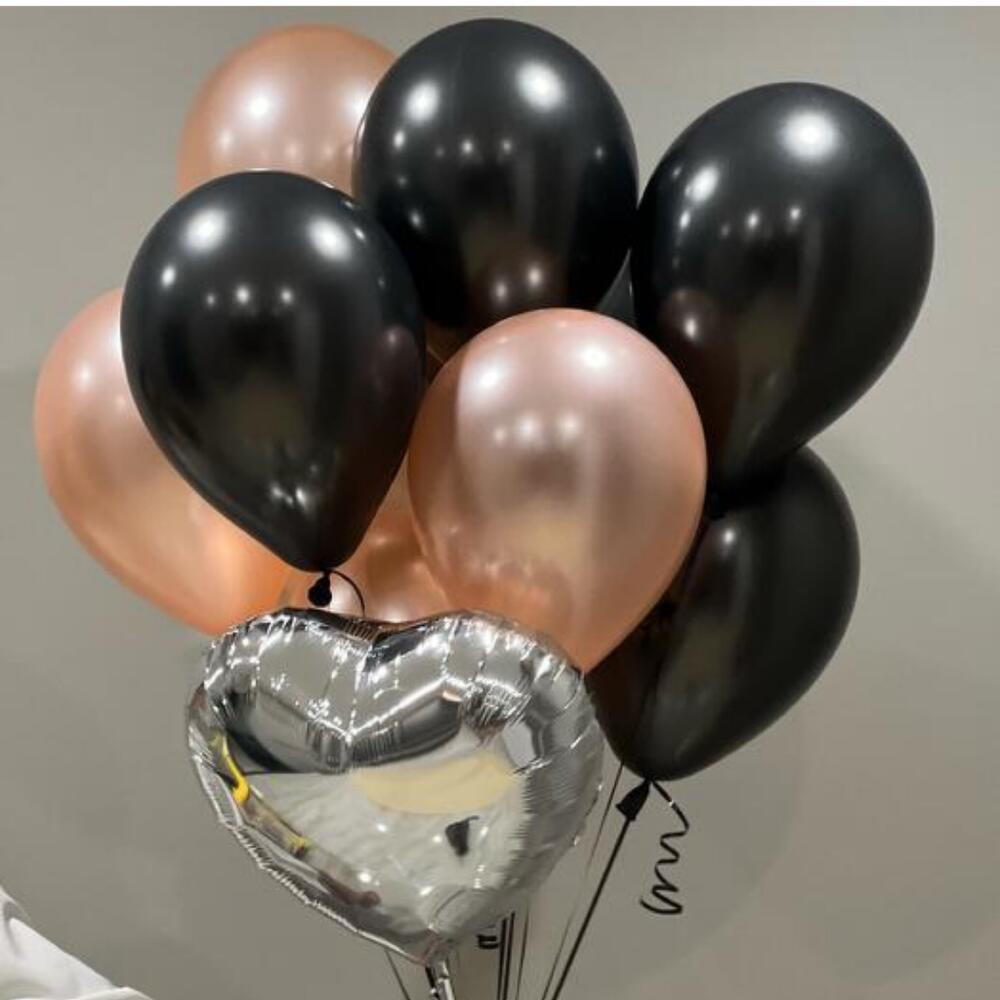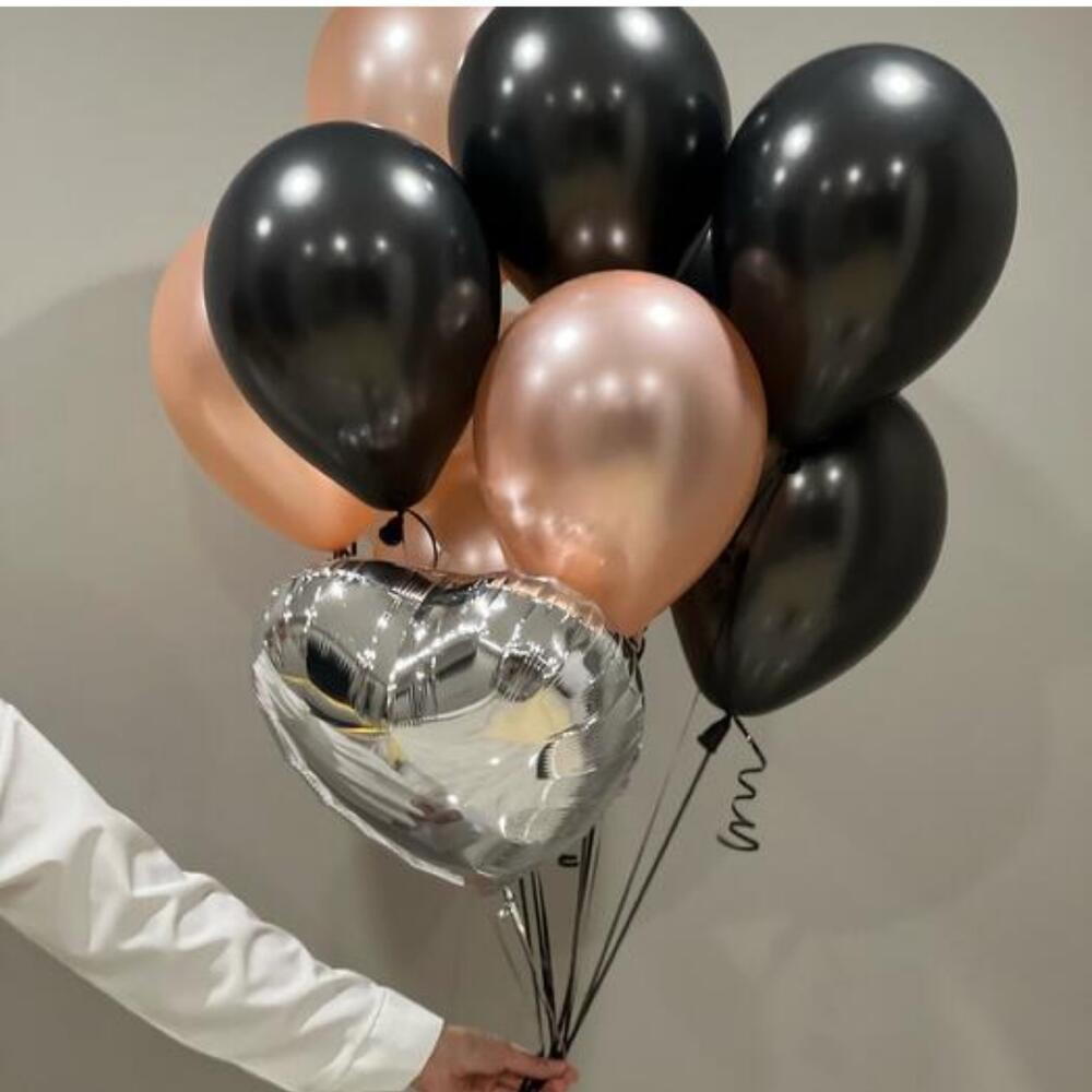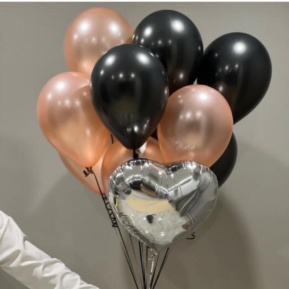 Строгая, но в то же время нежная связка шариков. Связка состоит из чёрных шаров, розового золота и серебристого зеркального сердца. Отличное сочетание, выглядит стильно и дороже, чем стоит. Состав: Чёрный шары 5 штук Шары розовое золото 5 штук Сердце фольгированное 1 штука Все шары качественные и не имеют запаха. Обрабатываются специальным гелем для продления полёта.