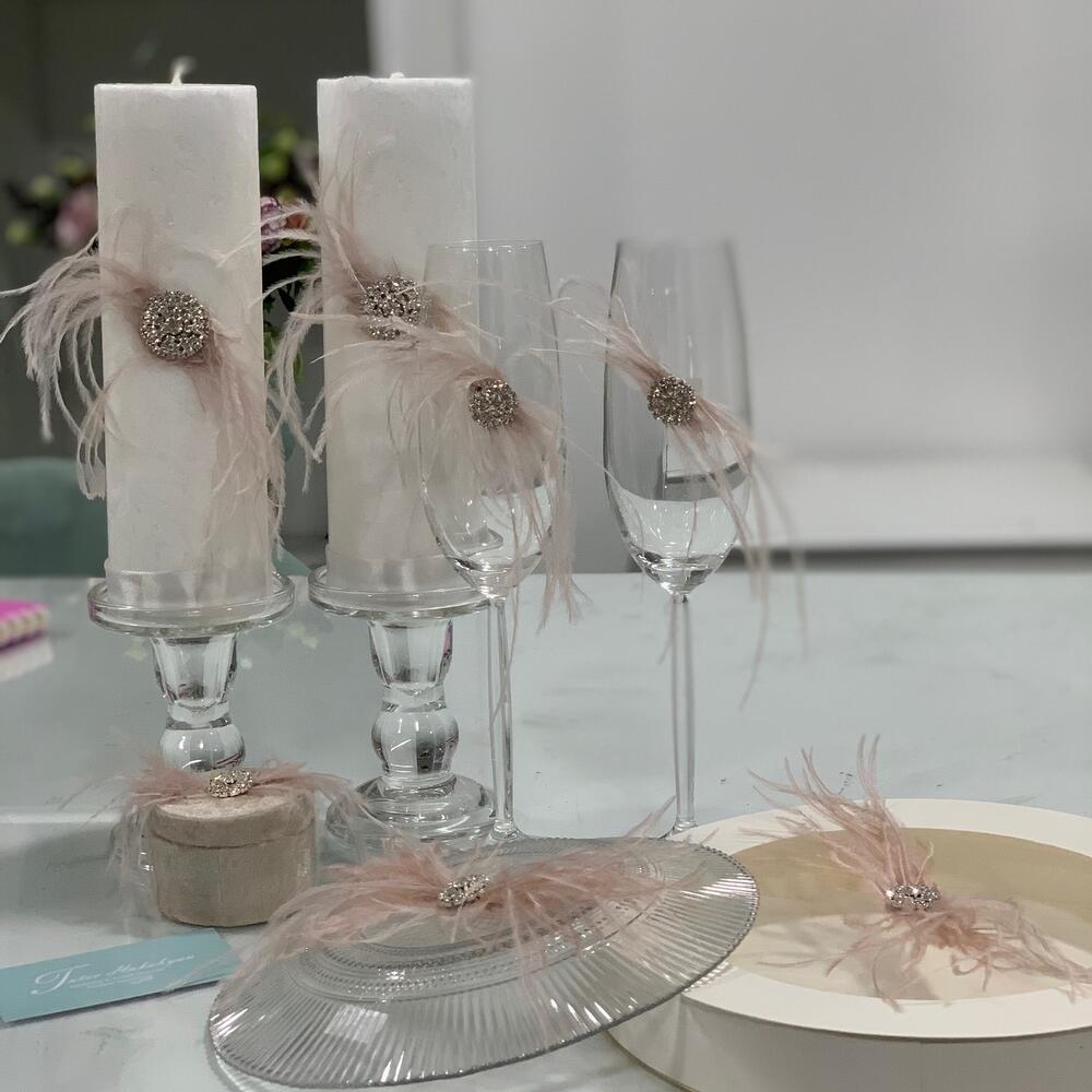 В комплекте 2 свечи , 2 подсвечники , и два бакала для Свадьбы