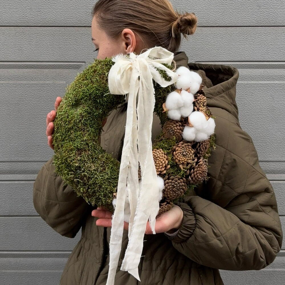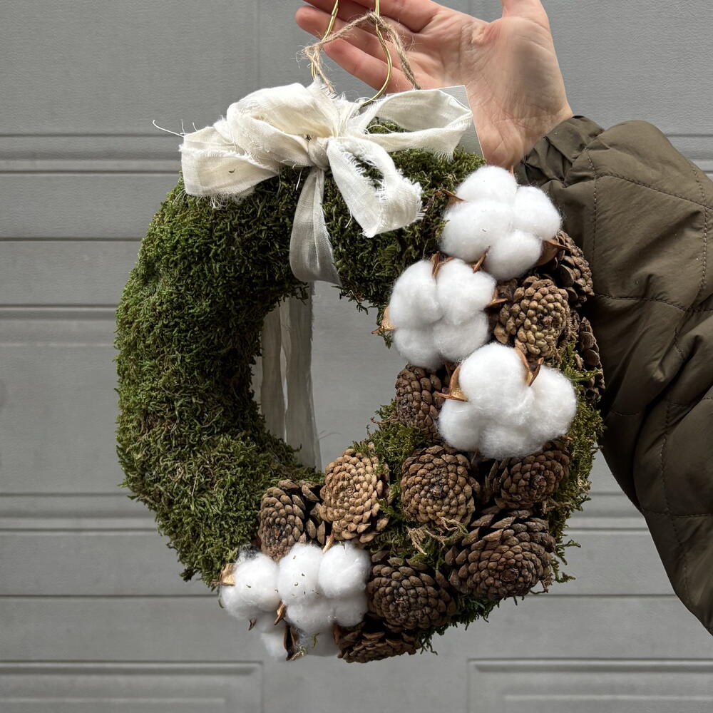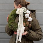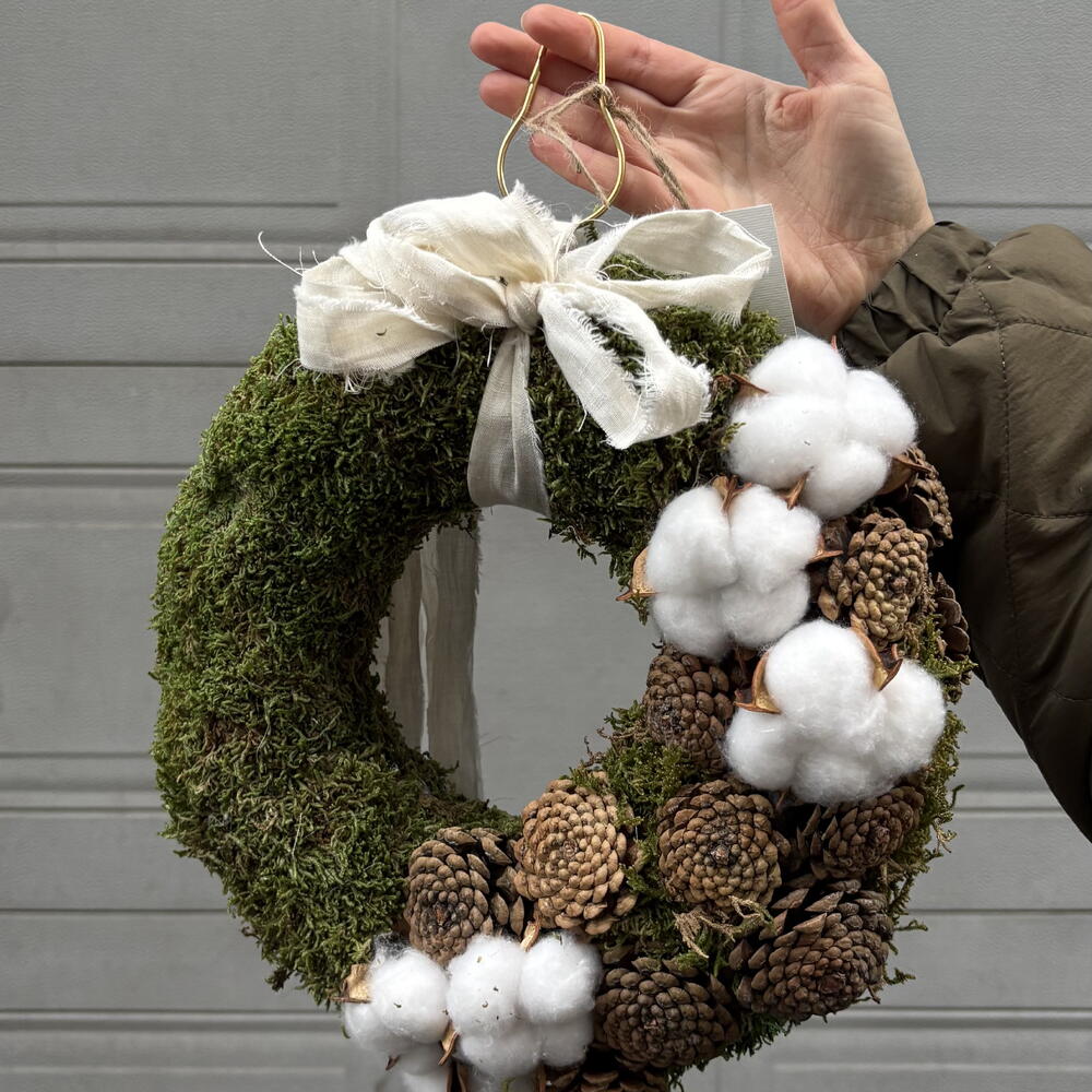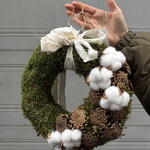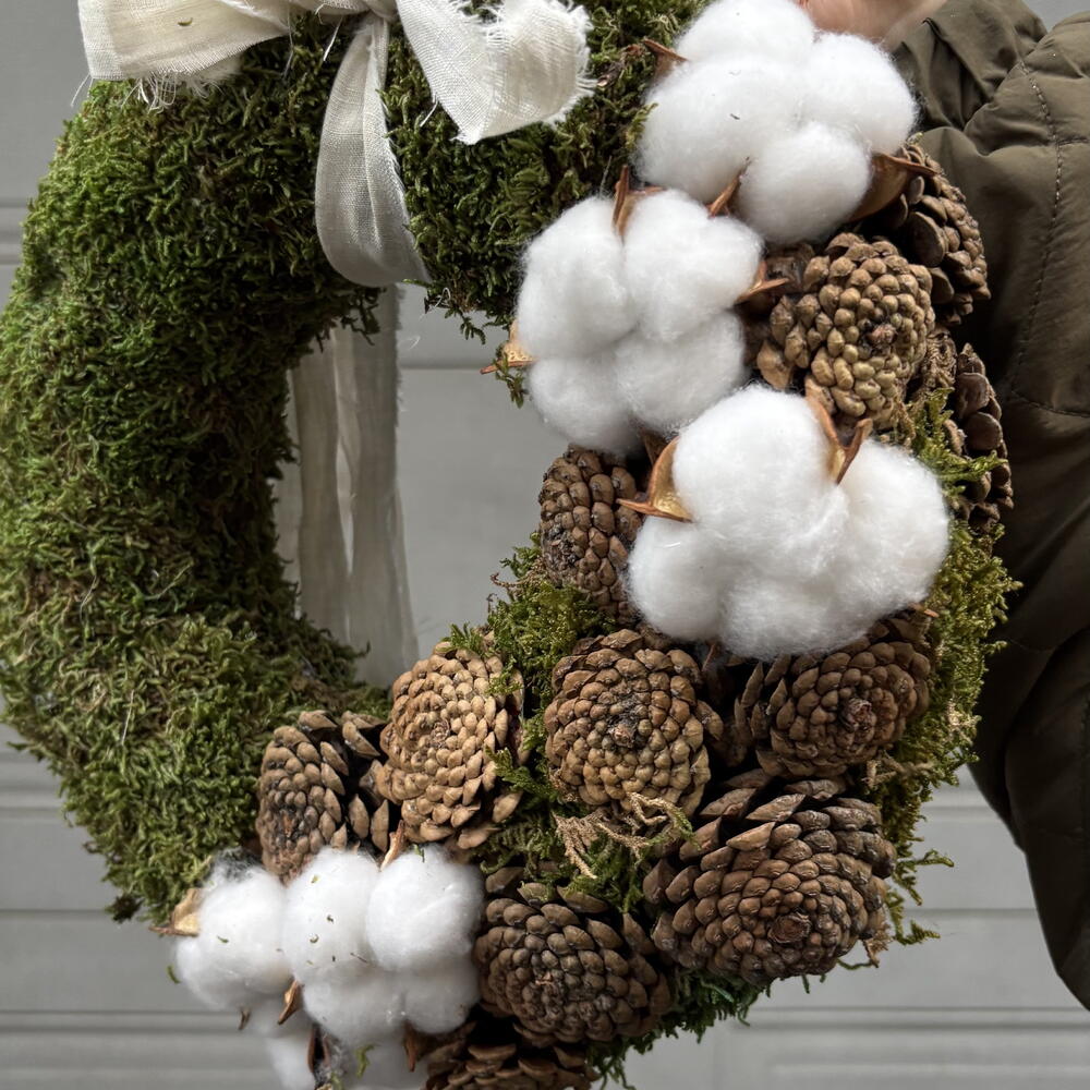The wreath is made of natural materials: cotton, moss and pine cones.