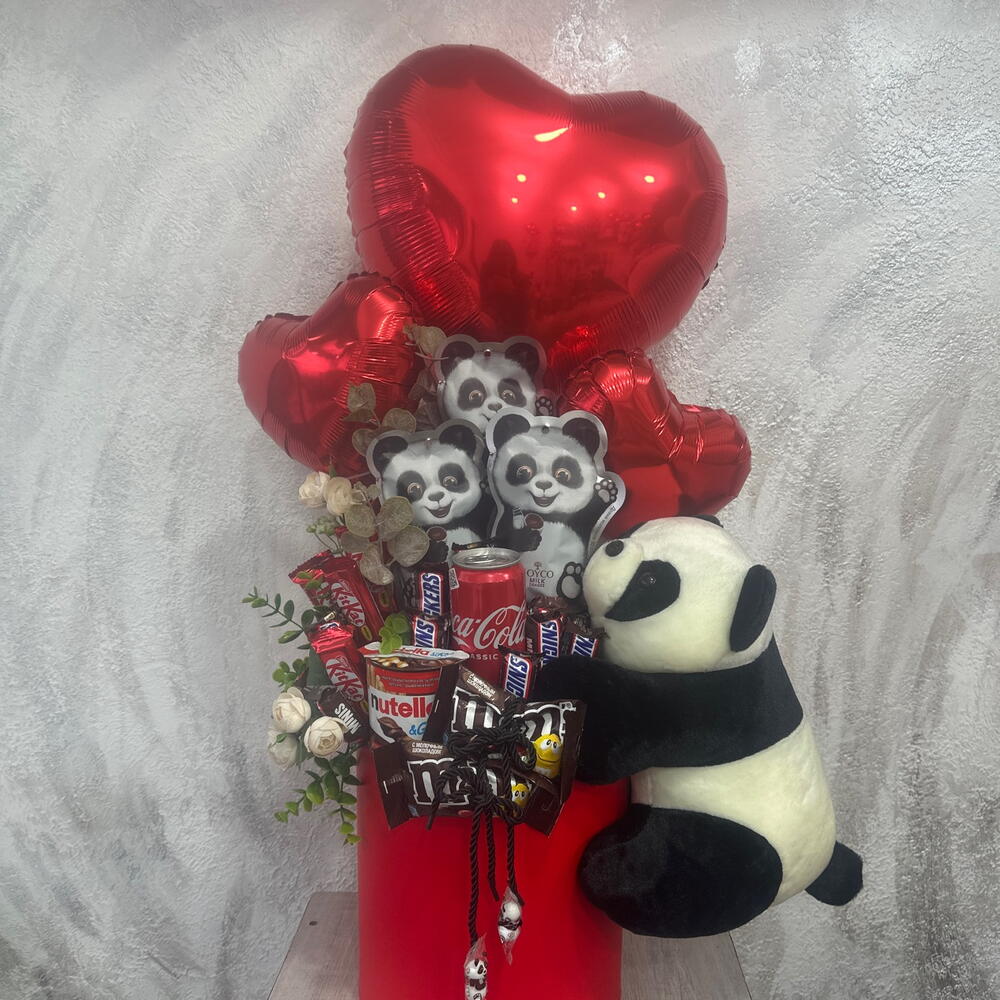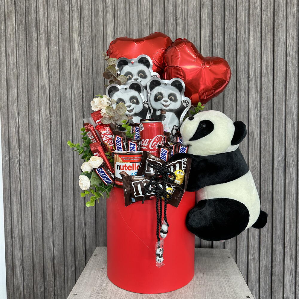 Коробка шляпная - 1 pz Сникерс - 9 pz Панда - 1 pz искусственные цветы - 10 pz конфеты драже панда - 3 pz кит кат мини - 4 pz шары виде сердца - 2 pz мэмэмденс - 2 pz кока кола в банке - 1 pz