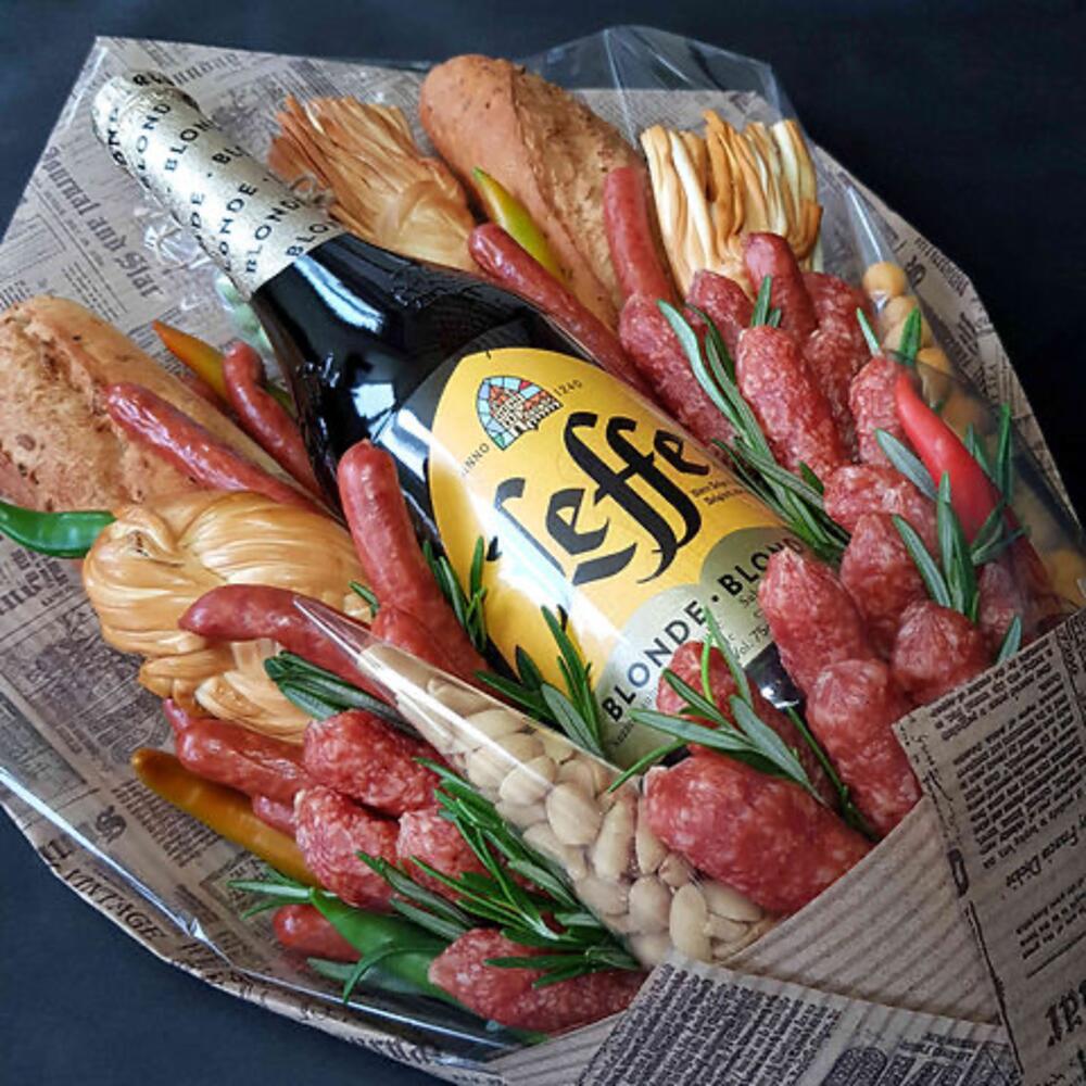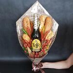 Этот мужской букет - это настоящий симбиоз вкусов и ароматов, специально для истинных ценителей. В его состав входит бутылочка изысканного пива Leffe объемом 0,33 л., которое прекрасно дополняют острые перчики - опасная приправа для настоящих мужчин. Букет украшает копченый сыр в виде косички, который пробуждает аппетит, и мини-колбаски в количестве 23 штук, подчёркивающие охотничью тематику. Композиция укомплектована шестью охотничьими колбасками и двумя багетами для настоящих гурманов. Вершина вкусовой нирваны - арахис, представленный в трёх видах: соленый, со вкусом васаби и с ароматом креветок. Каждый из них - 150 грамм чистого удовольствия. И, конечно, в конце вас ждет приятный акцент - 30 грамм розмарина, который добавит букету своего неповторимого аромата. Этот букет - идеальный подарок для настоящего мужчины.