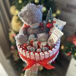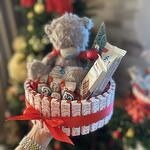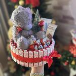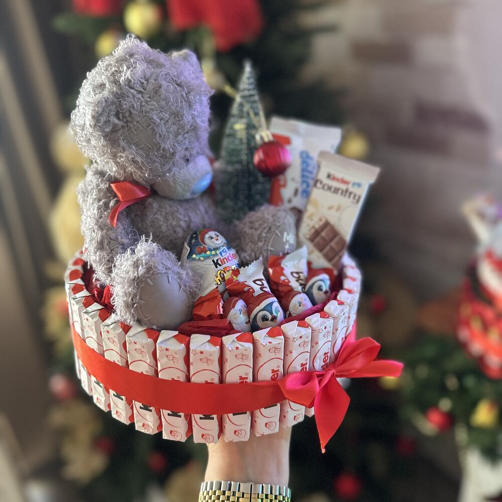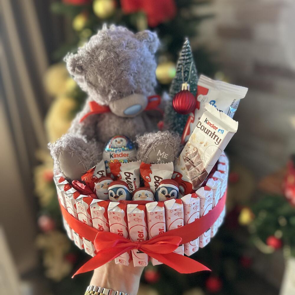 Новогодняя композиция с мишкой Тедди и елочкой. Разнообразные конфеты киндер, которые любят все от мала до велика. Композиция будет отличный подарком на Новый год и Рождество как ребенку так и взрослому.
