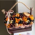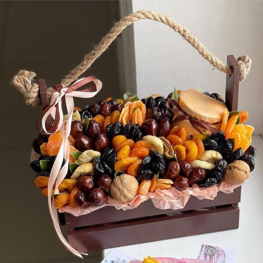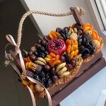 Гранат - 1 pz Корзина деревянная - 1 pz Курага - 200 g Чернослив - 100 g Инжир сушеный - 200 g грецкий орех в скорлупе - 5 pz финики королевские - 100 g