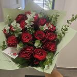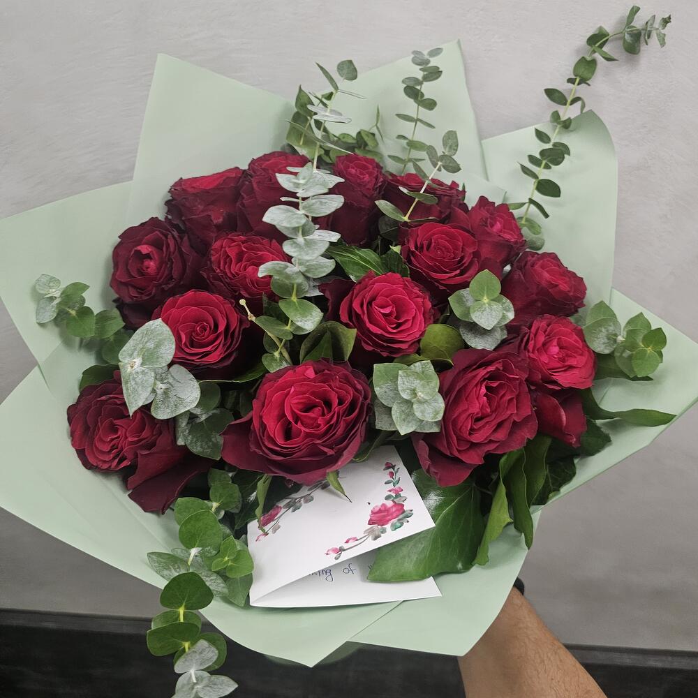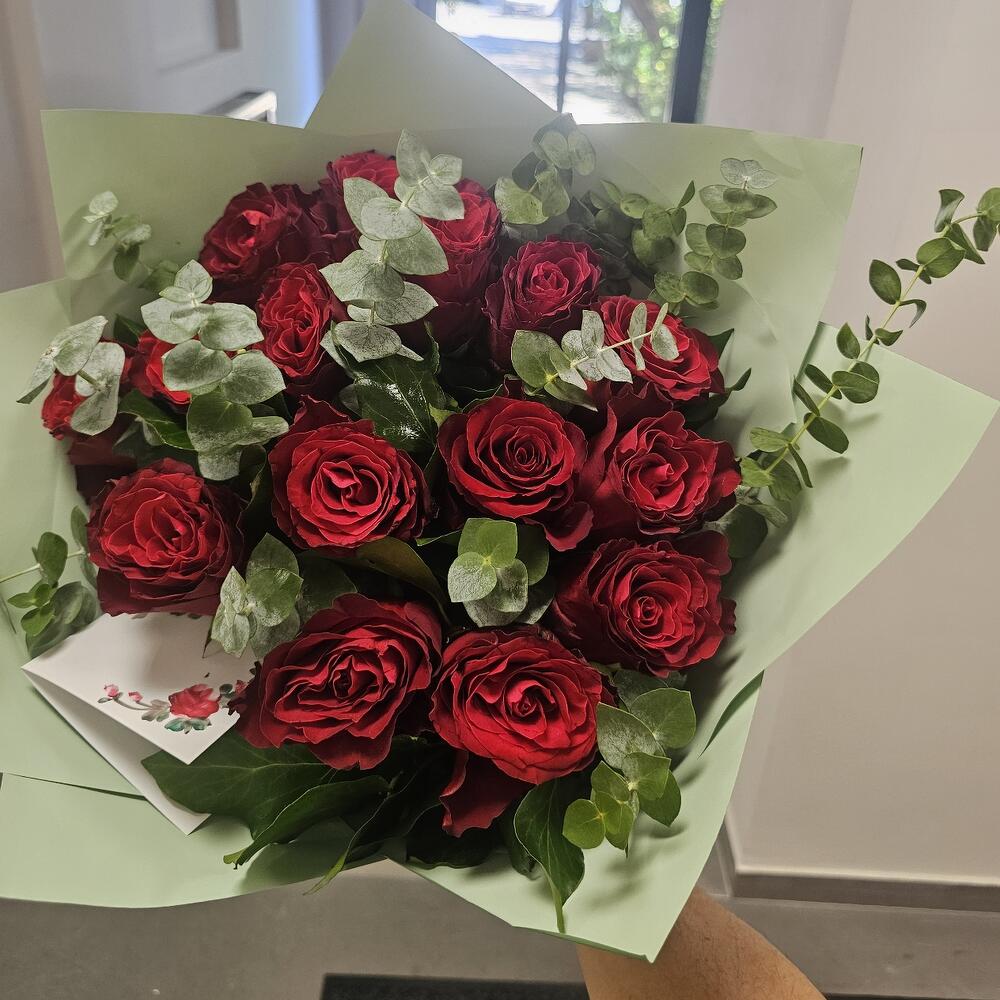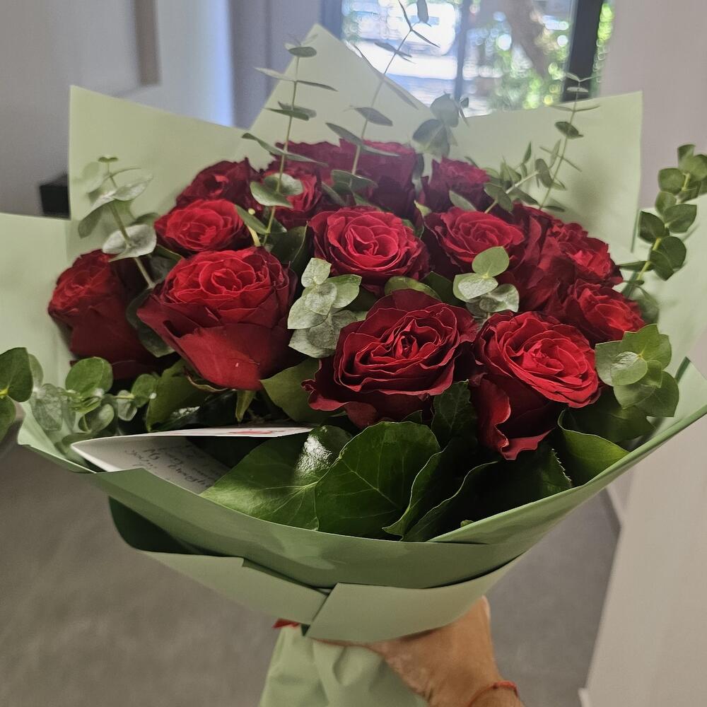 eucalyptus leaves - 10 pz sarin ribbon - 1 pz hedera leaves - 5 pz red roses premimum quality - 15 pz paper wraping - 1 pz