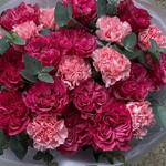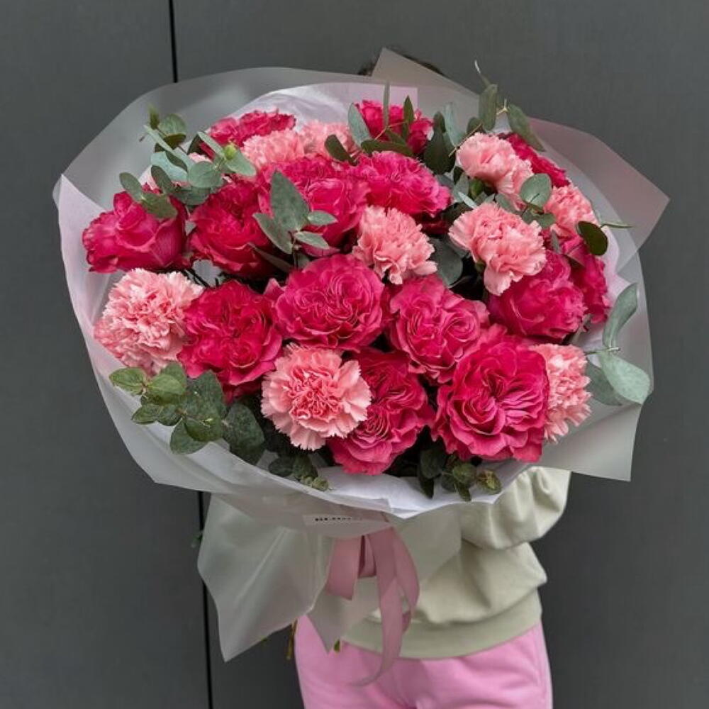 Ten bukiet to połączenie klasycznej elegancji z naturalną świeżością. Delikatne róże spotykają się z trwałymi goździkami, a całość otula aromatyczny eukaliptus, który nadaje kompozycji lekkości i nowoczesnego charakteru.