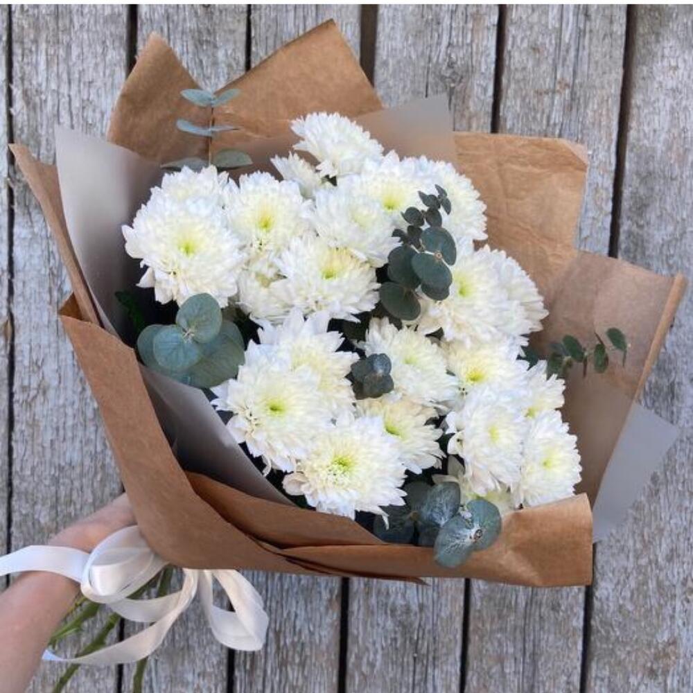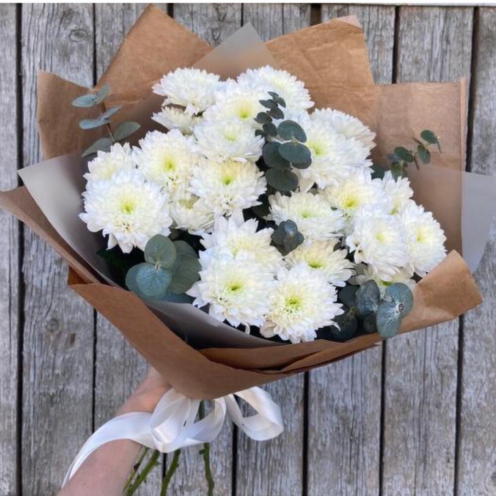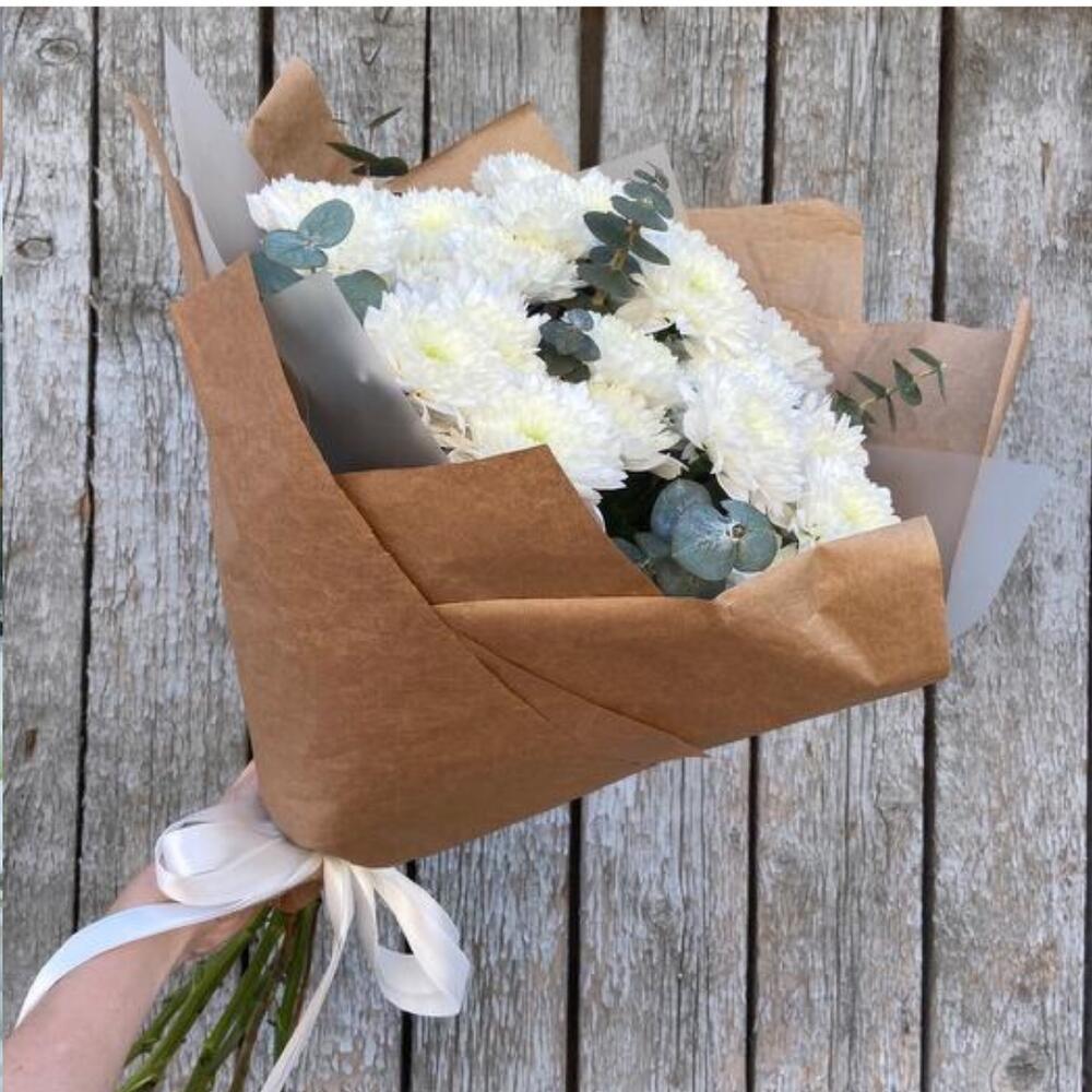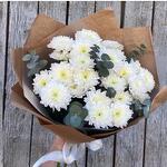 Нежный букет из хризантемы кустовой, в дизайнерской упаковке Рекомендуем через день подрезать стебли и менять воду, так ваш букет прослужит дольше!
