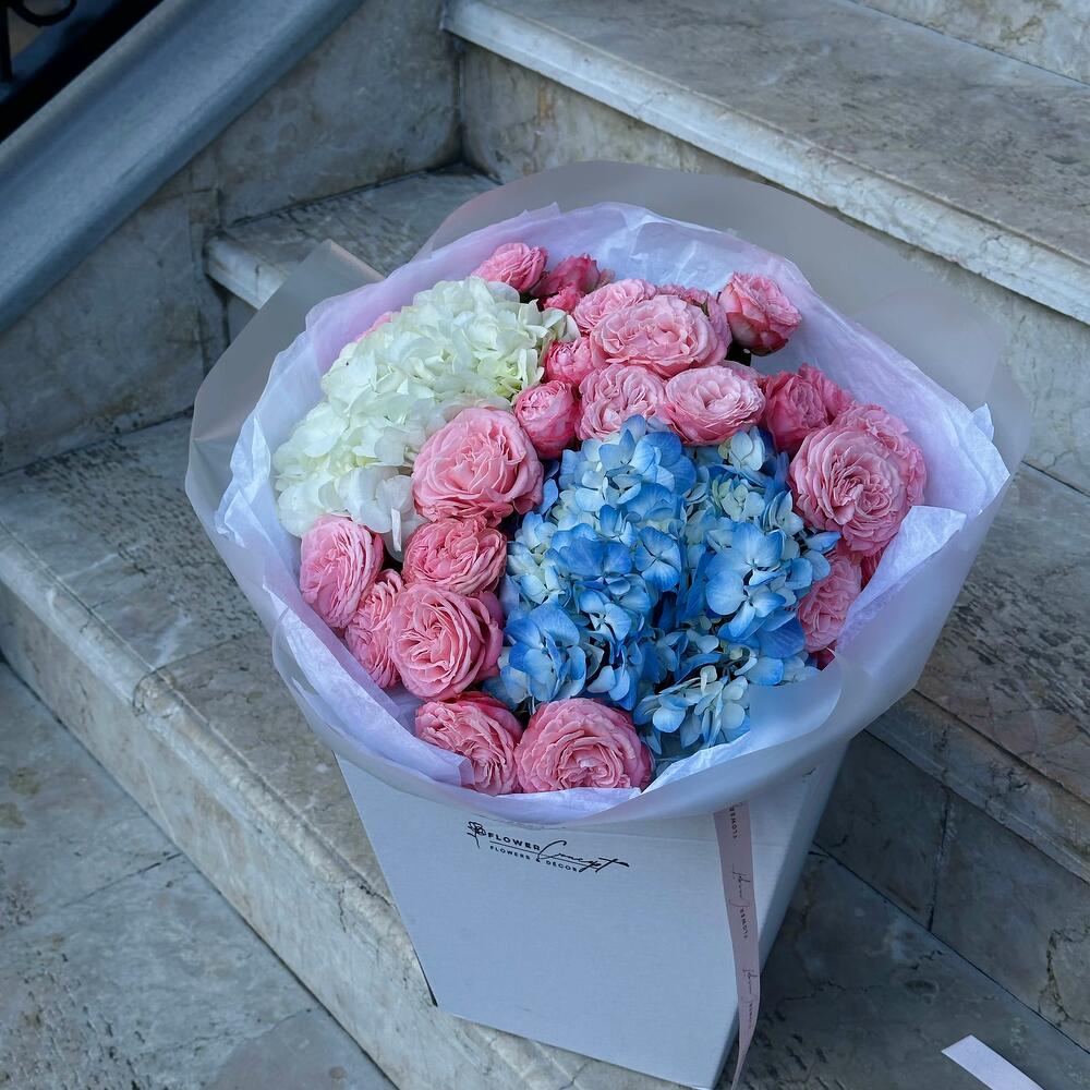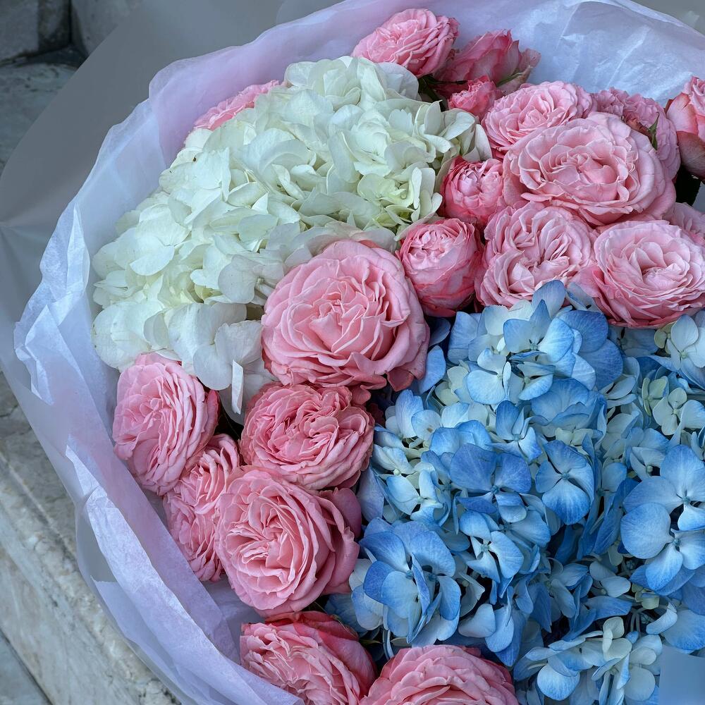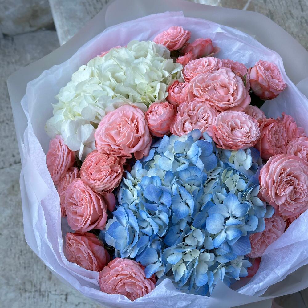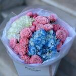 Букет из гортензий и кустовых роз — гармоничное сочетание пышности и изящества. Объемные гортензии придают композиции легкость и воздушность, а кустовые розы добавляют романтики и утончённого шарма. Идеален для тёплого признания, комплимента или как знак внимания.