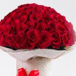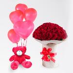 A bouquet of 50 stems red roses, 5 heart shaped red balloons and 30cm height red teddy bear.