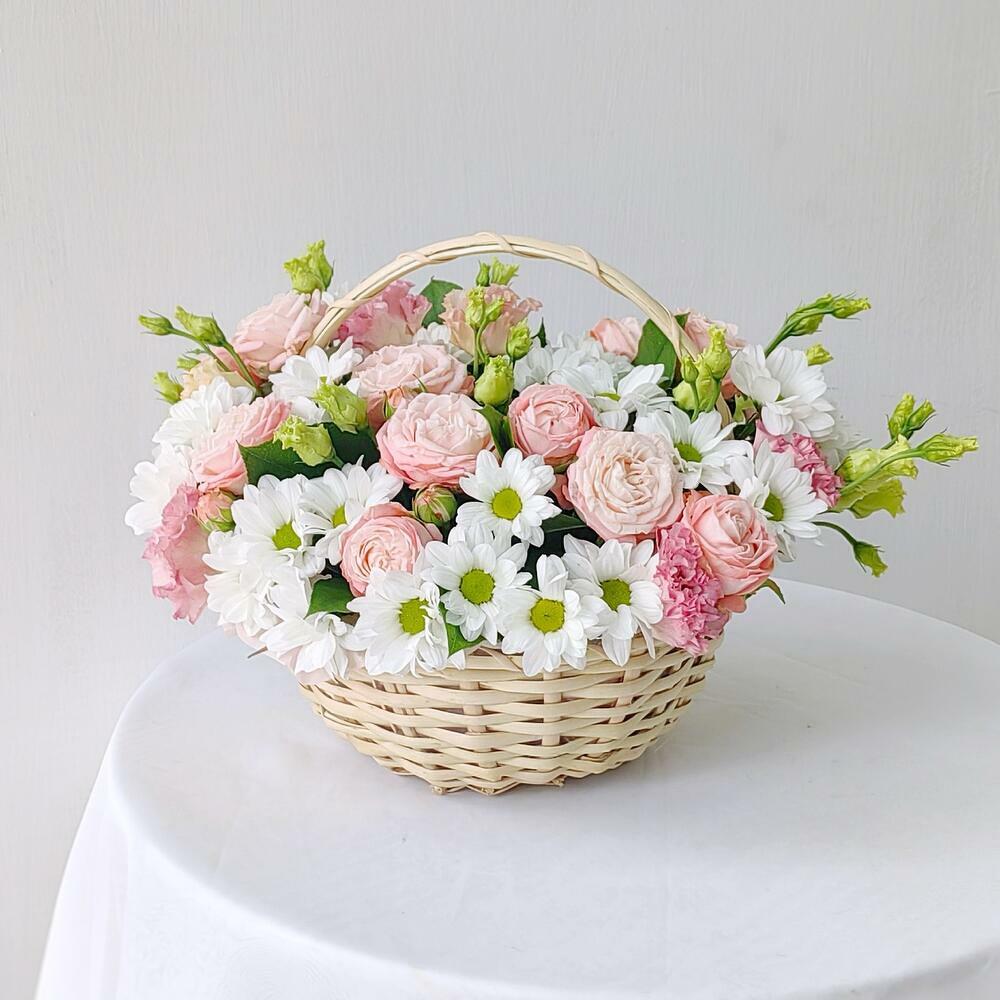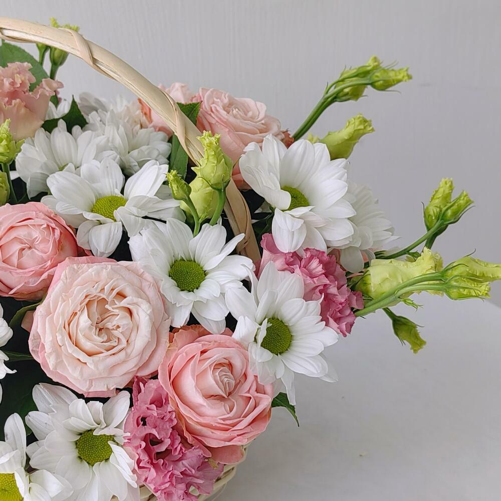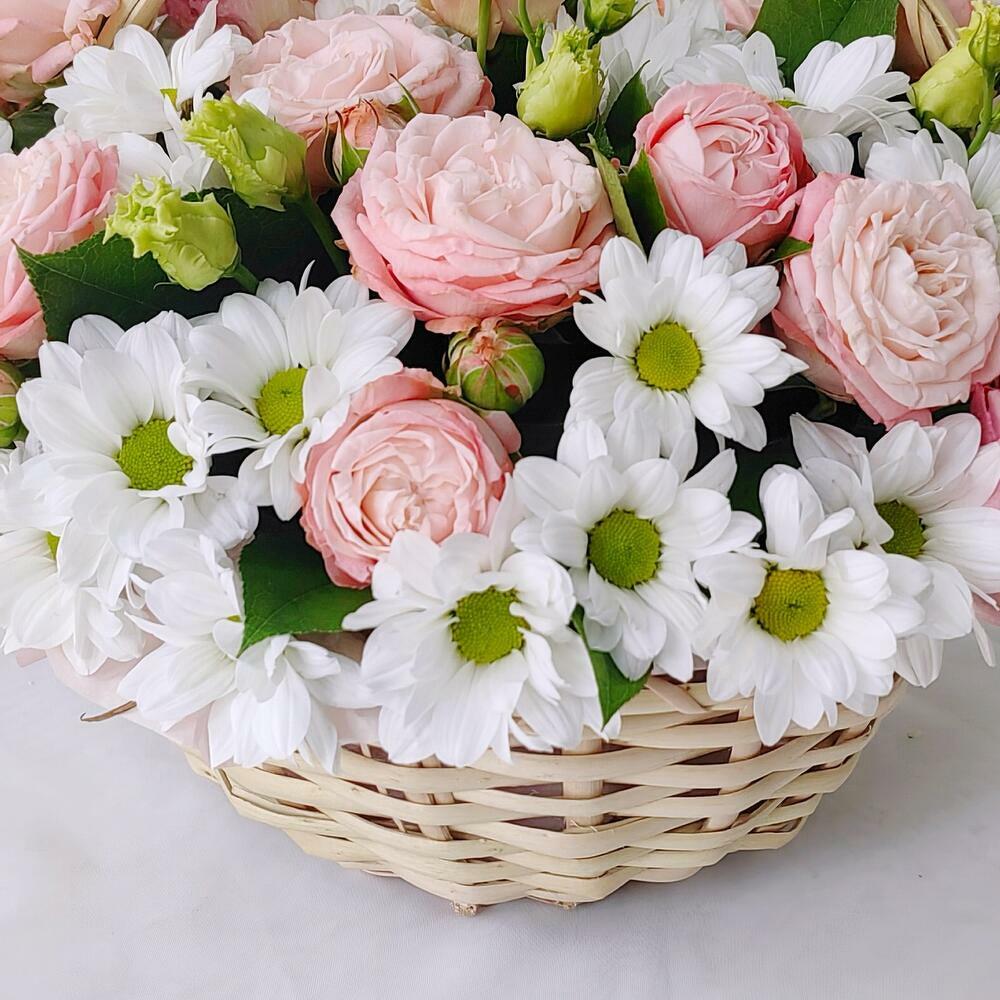 Цветочная композиция с пиновидными кустовыми розами, белыми ромашками хризантемами и белой эустомой. Букет в плетенной корзине с розами станет прекрасным подарком маме, сестре, бабушке или дочери в день рождения. К каждому букету дарим подарок. Это средство для продления свежести цветов и инструкция по уходу за ним.
