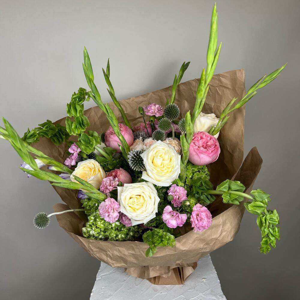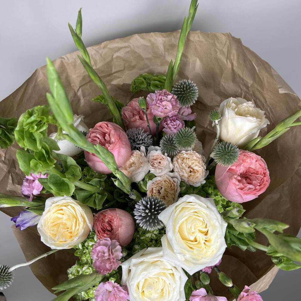 Eringium - 3 pz mini garofani - 5 pz rosa da giardino rosa - 5 pz ortensia - 6 pz rose spray - 2 pz rose avorio - 7 pz campane irlandesi - 5 pz gladioli - 5 pz