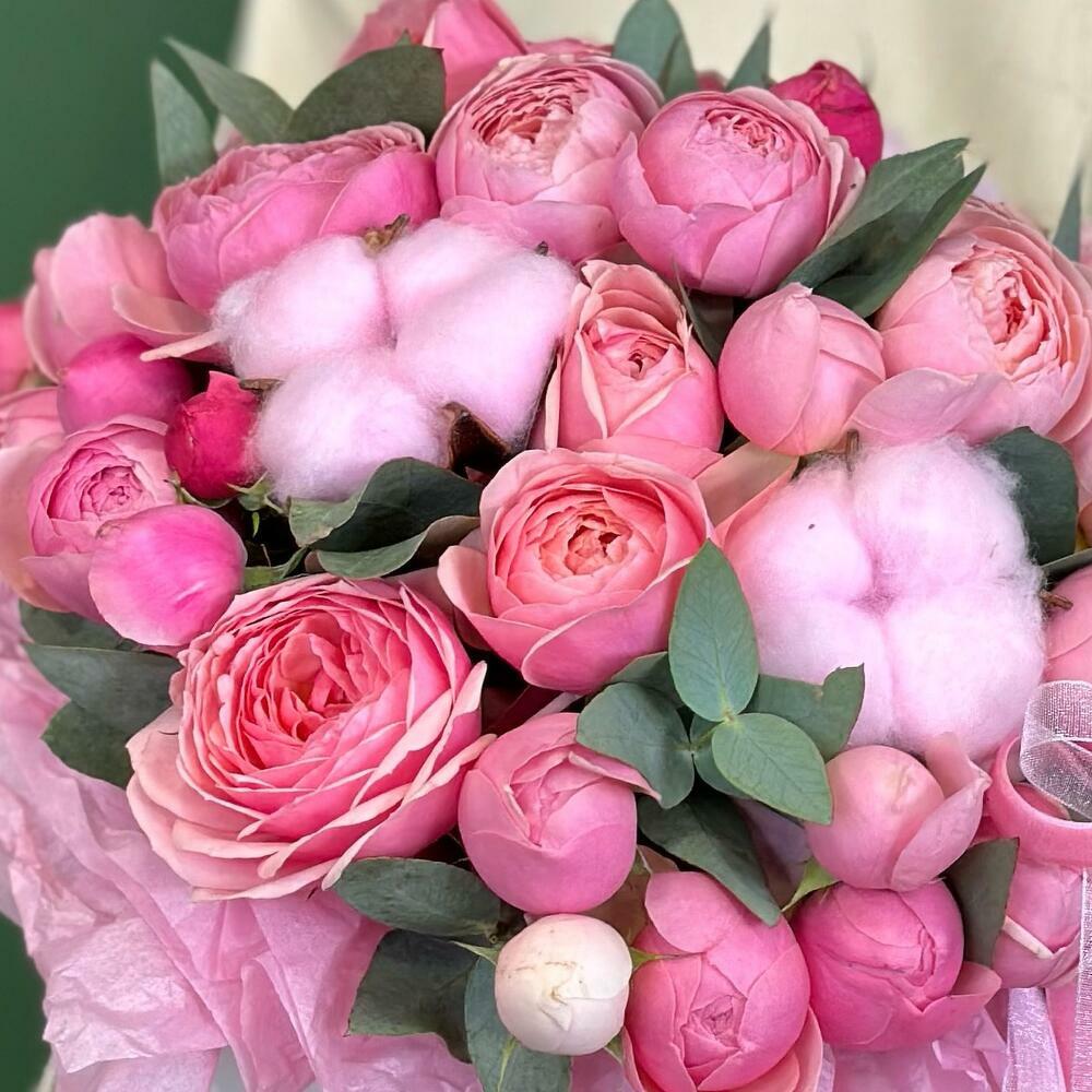 Коробочка с кустовыми пионовидными розами ,эвкалиптом и хлопком
