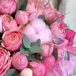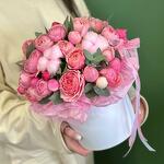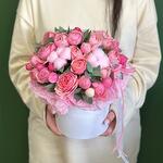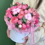 Хлопок - 3 pz Eucalipto - 5 pz Silenzio - 2 pz Коробка шляпная - 1 pz Атласная лента - 1 pz биофлор - 1 pz кустовая роза сильва пинк - 10 pz