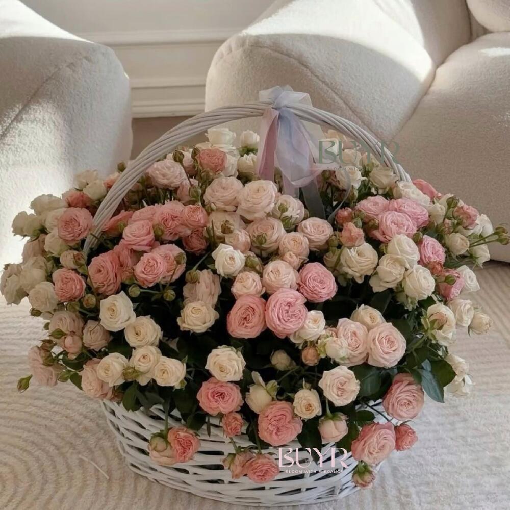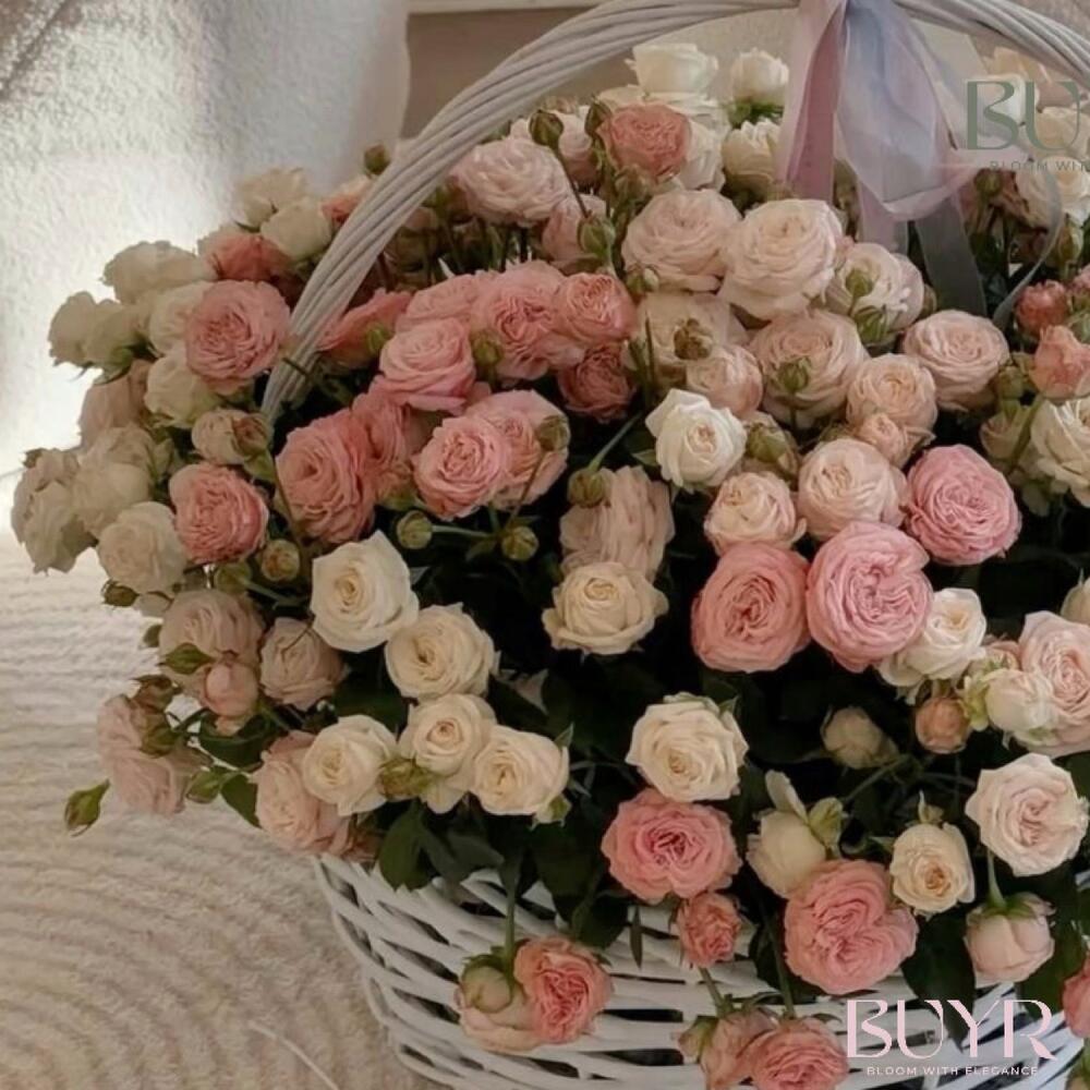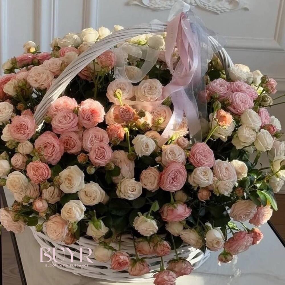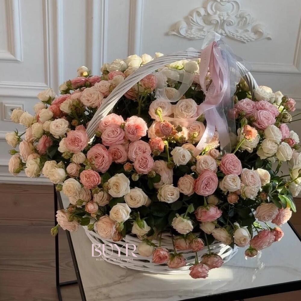 Роскошная корзина, наполненная кустовыми розами нежно-розовых и кремовых оттенков. Идеальный подарок для особого случая — будь то день рождения, свадьба или просто знак внимания, чтобы выразить самые тёплые эмоции. Эта композиция станет настоящим украшением интерьера и подарит атмосферу уюта и гармонии.