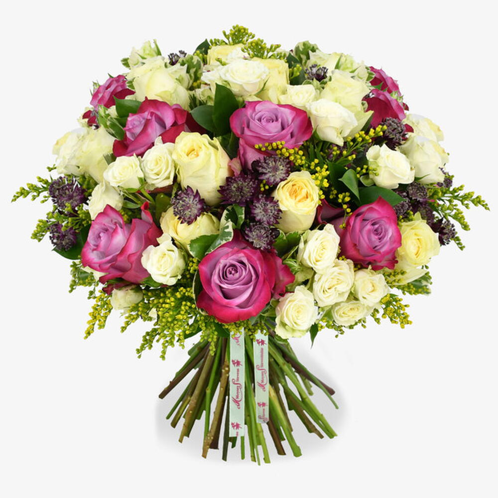 purple astrantia - 5 pz yellow solidago - 5 pz rose spray bianche - 8 pz rose gialle - 8 pz deep purple roses - 8 pz seasonal greenery (bunch) - 1 pz