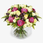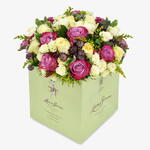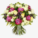 Sweet and soft yellows are the theme of this beautiful bouquet! Soft and pastel-like roses combine with white spray roses and yellow solidago to give this arrange its golden hues. Contrasted beautifully with pops of colour provided by our purple two toned roses and dainty astrantia.