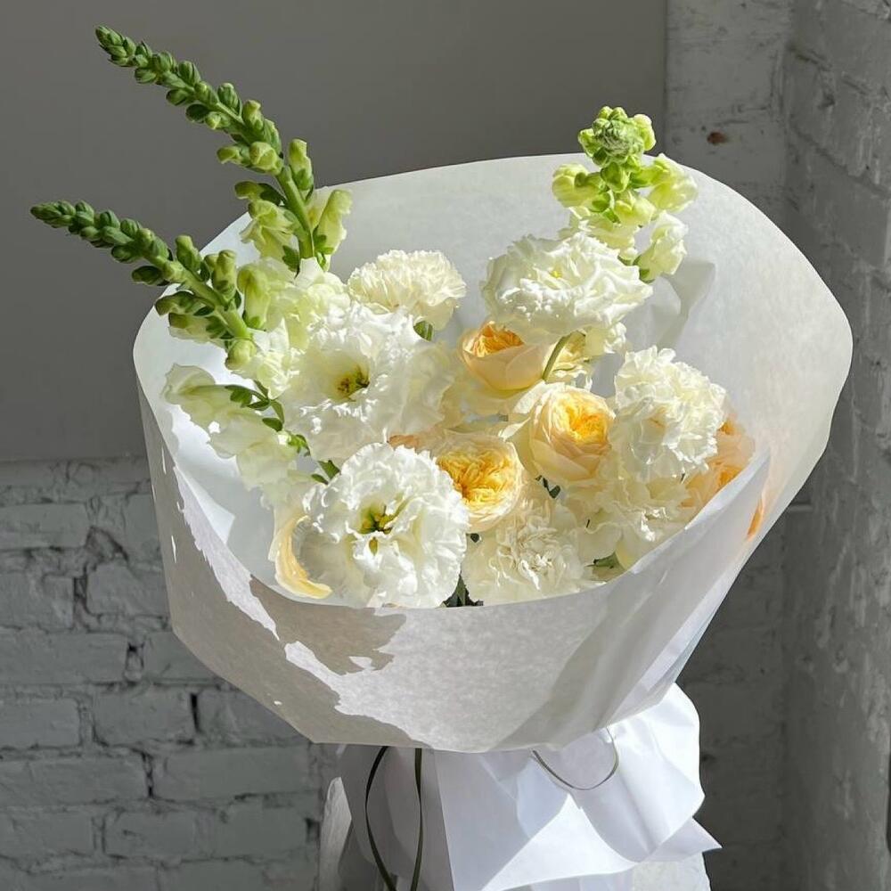 bocche di leone - 3 pz garofani bianchi - 5 pz roses - 5 pz luisantus - 3 pz