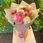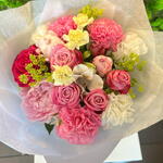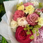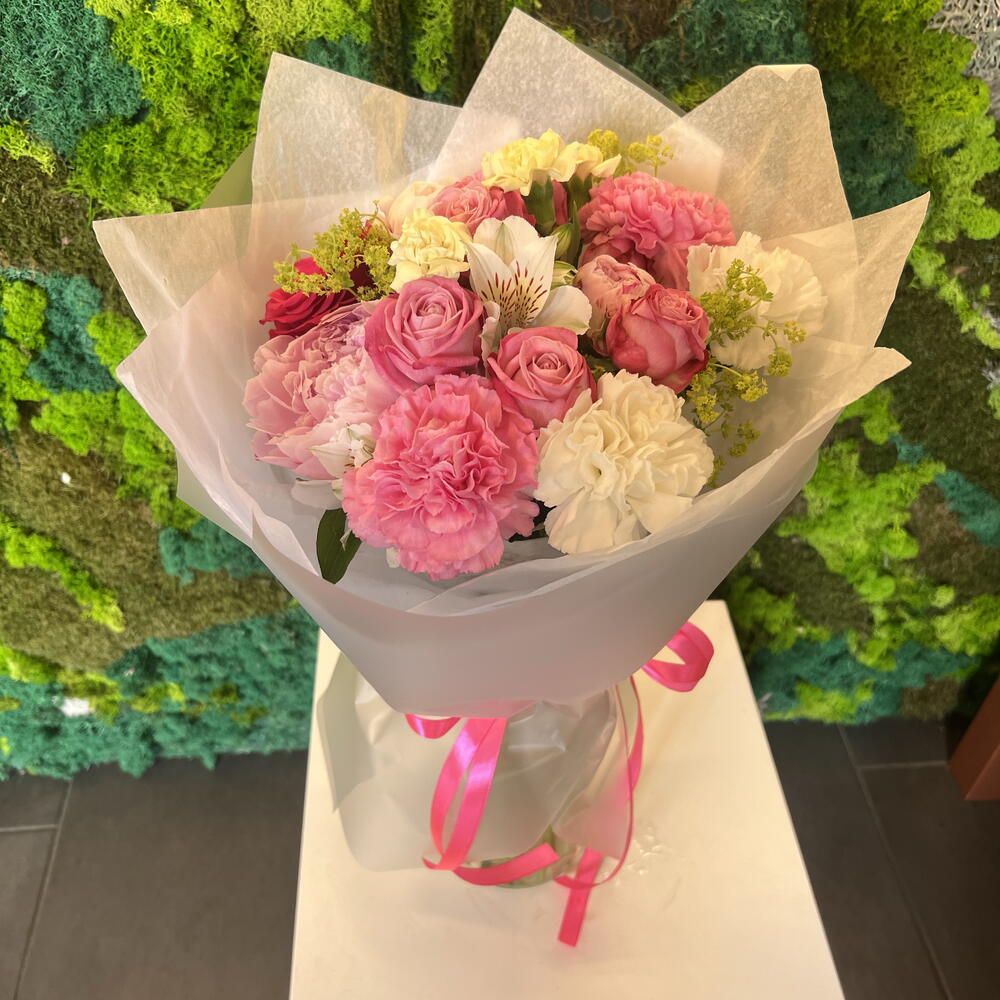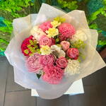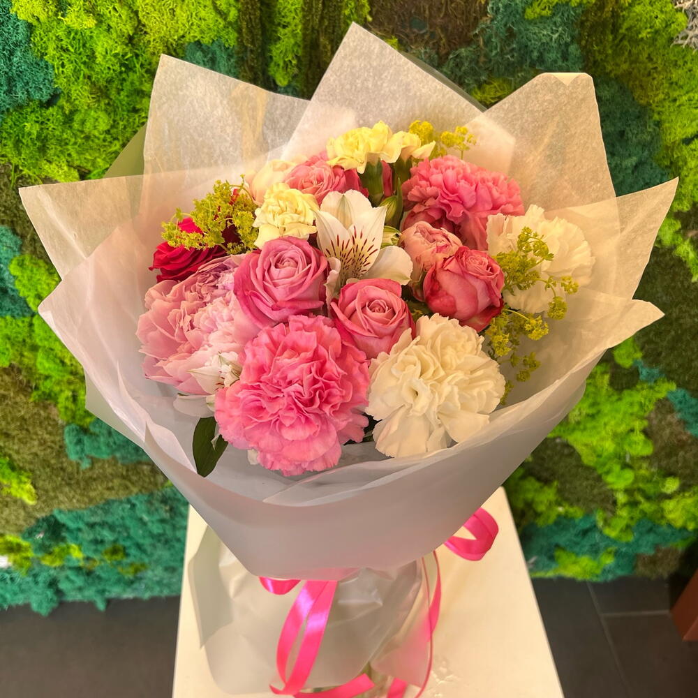 Alstroemeria - 1 pz garofano - 3 pz rosa ramificata - 1 pz rosa rosa - 1 pz rosa peonia - 2 pz garofano a ramoscello - 2 pz