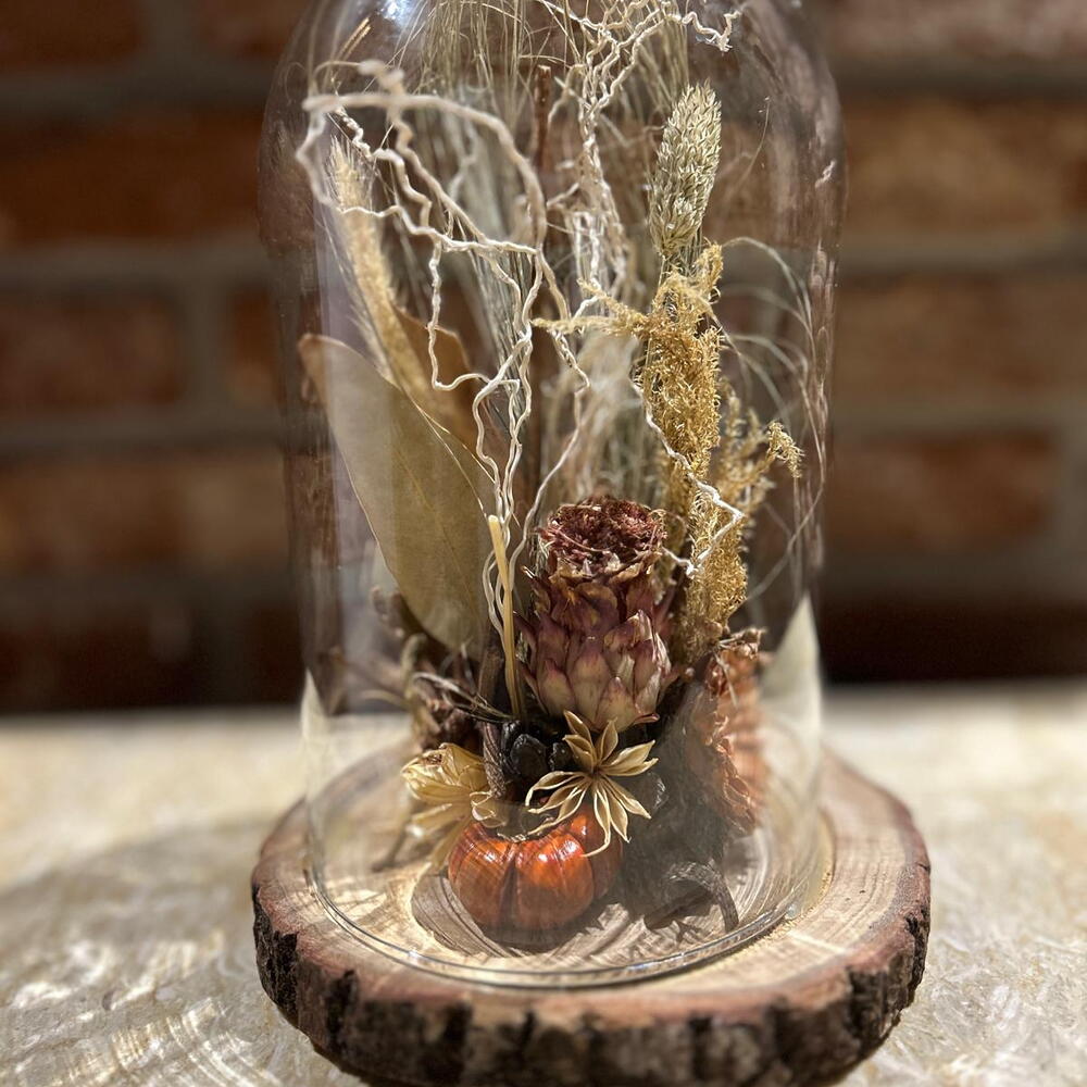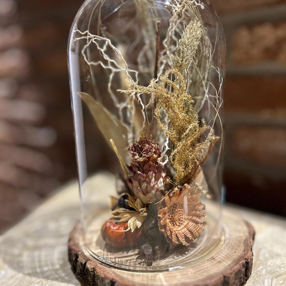 grass - 4 pz wheat - 2 pz zucca - 1 pz flower - 1 pz foglia di palma - 1 pz natural dried flowers - 1 pz glass bell - 1 pz twigs - 4 pz wooden stand - 1 pz