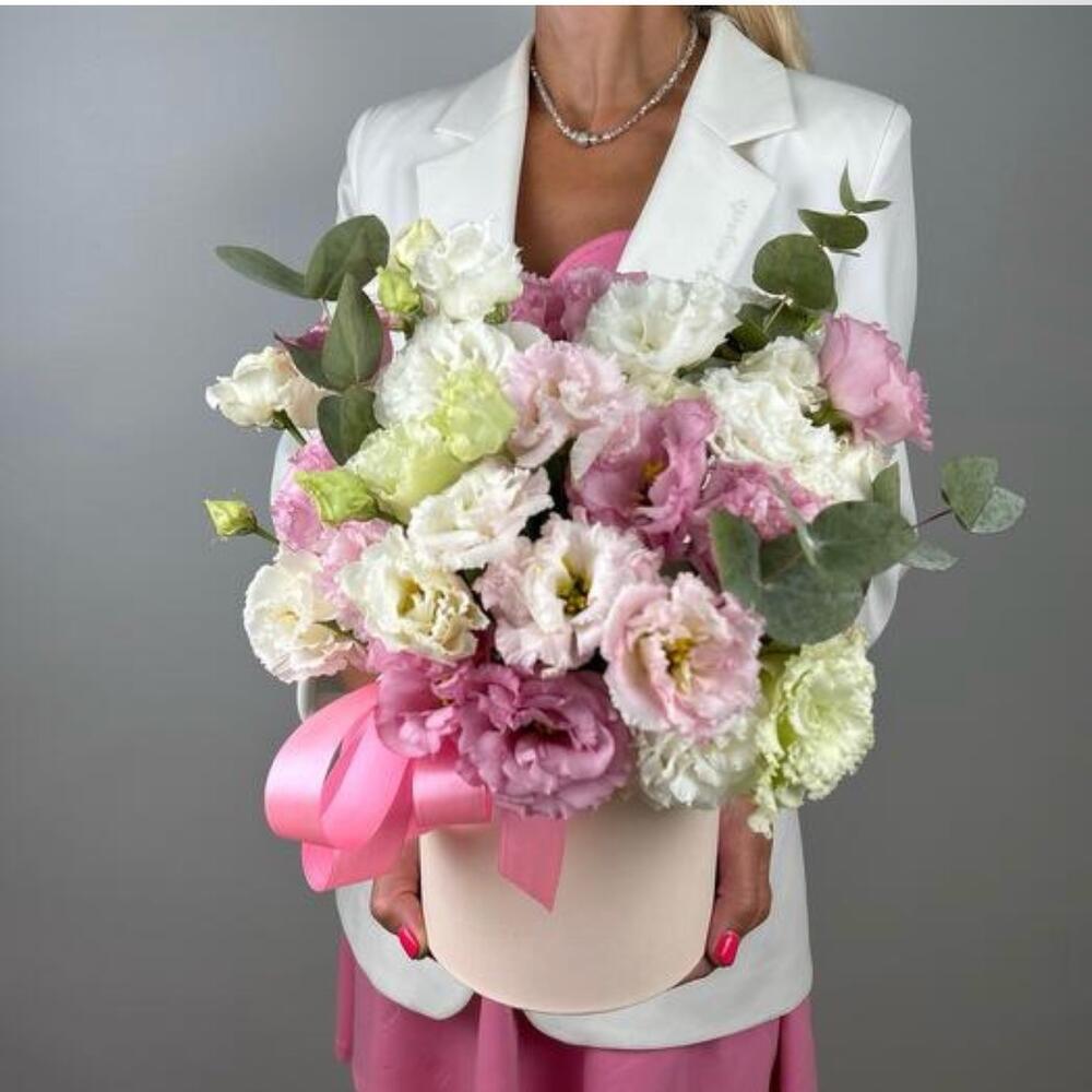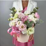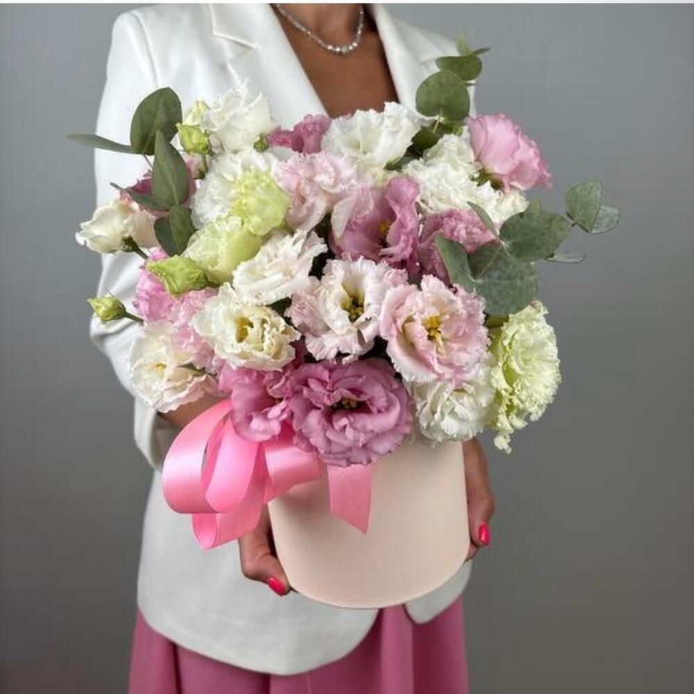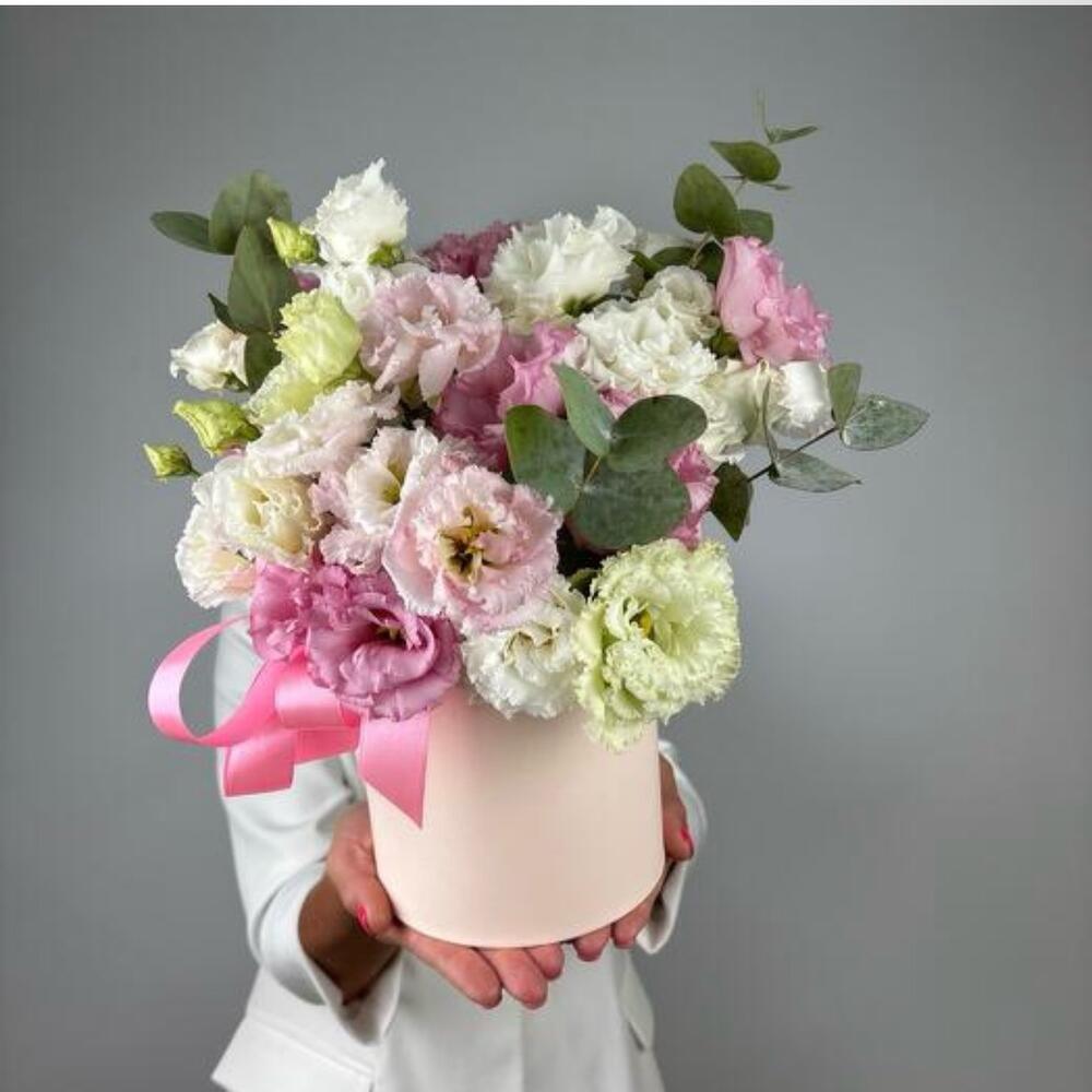 Eucalipto - 3 pz Коробка шляпная - 1 pz Атласная лента - 1 pz Оазис флористический - 1 pz эустома микс - 11 pz