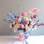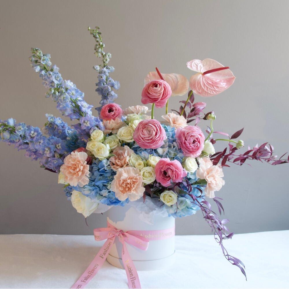 Anturio - 2 pz Rusco - 5 pz garofano - 10 pz ranuncolo - 10 pz ortensia blu - 15 pz rosa da cespuglio - 10 pz delphinium blu - 50 pz