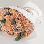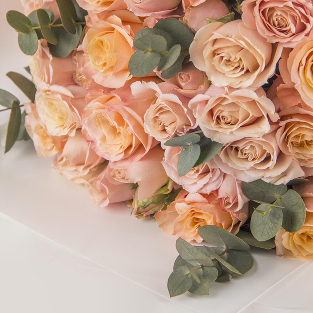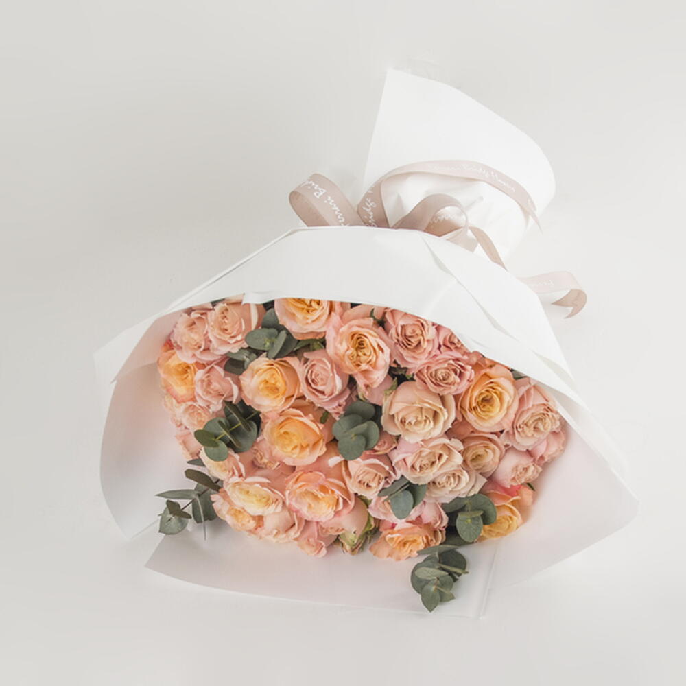 A hand bouquet of peach roses with eucalyptus leaves wrapped with white wrapping.
