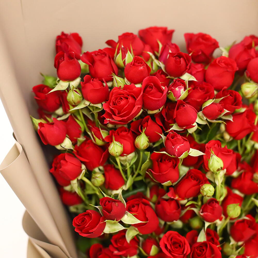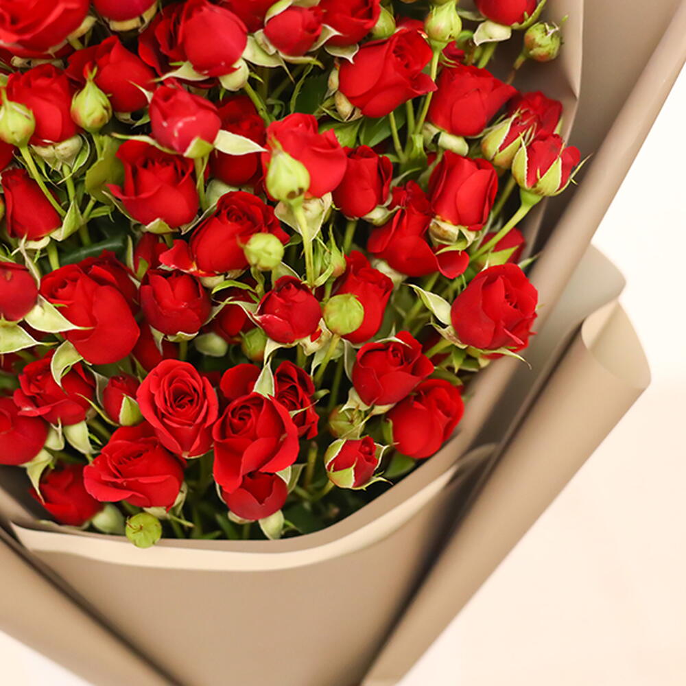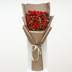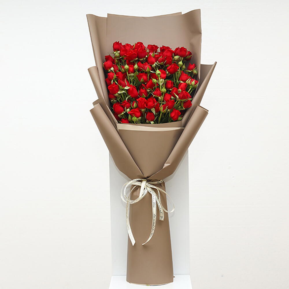 A hand bouquet of red baby roses wrapped with brown wrapping