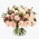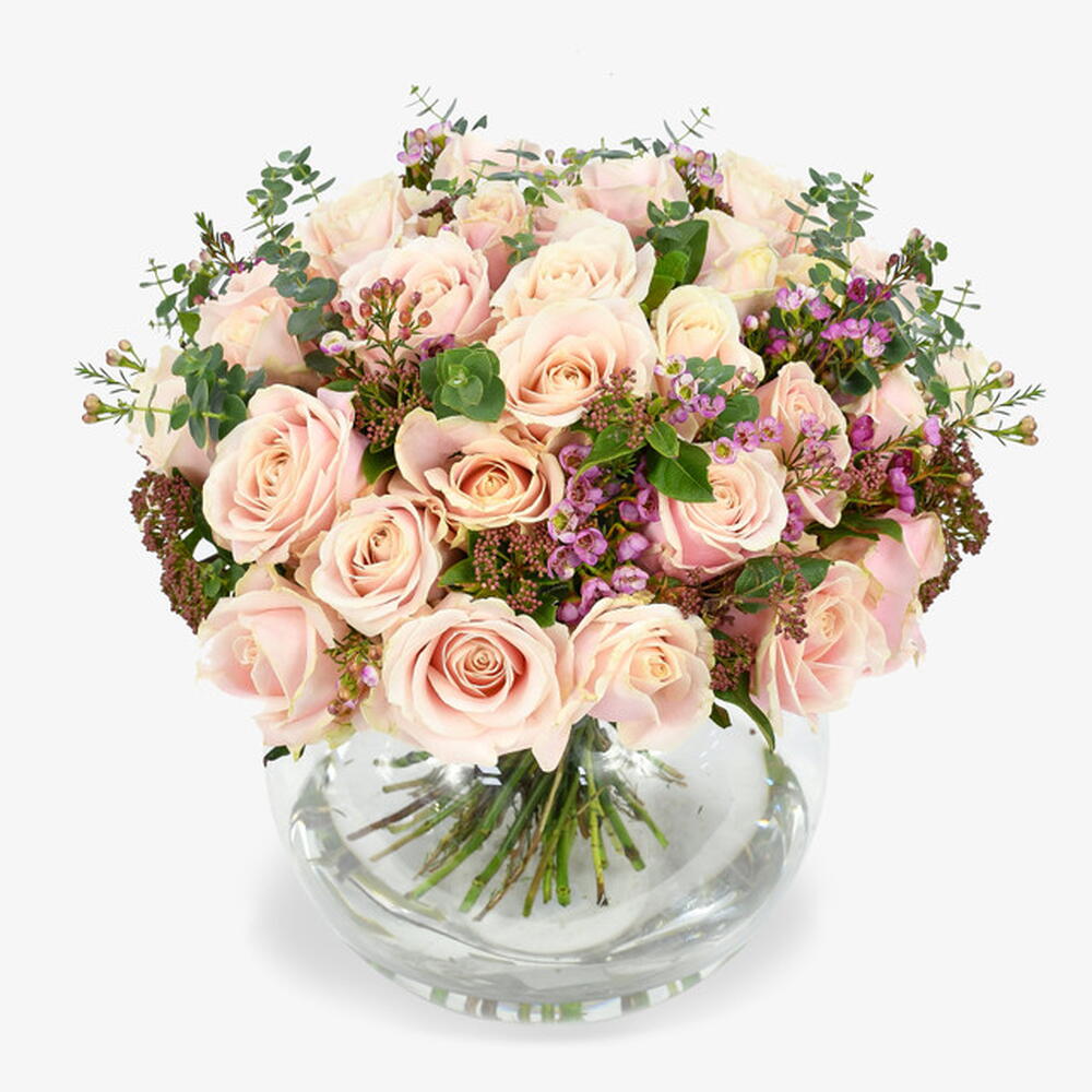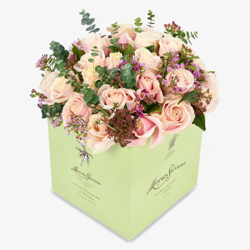 Our premium pink roses, pink wax flower and fragrant eucalyptus. This is elegant floristry at its very best: balance, symmetry and poise plus the irresistible, unmissable, Moyses charm seasonal greenery.