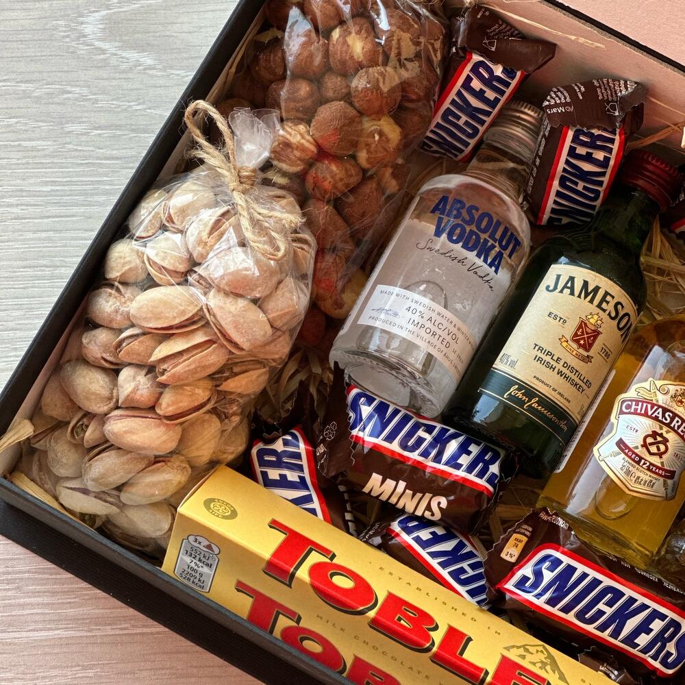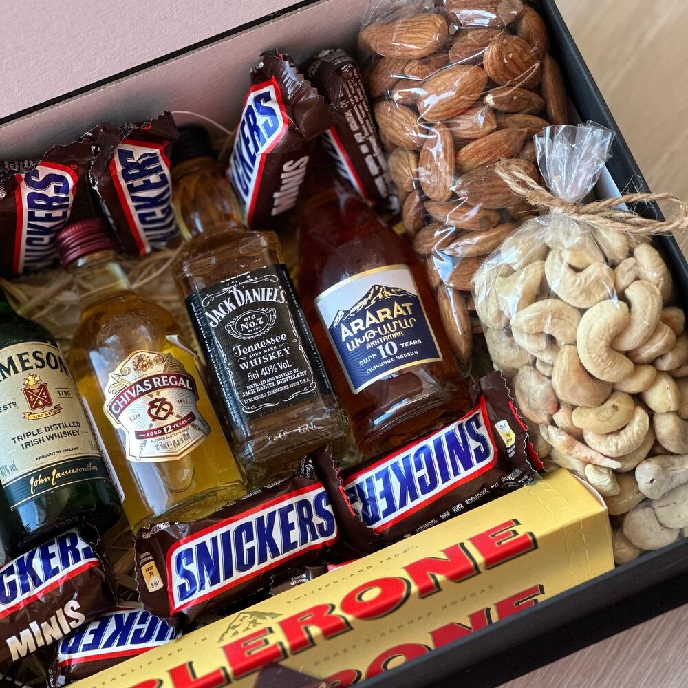 Фисташка - 120 g Коробка - 1 pz Кешью - 120 g Mandorla - 120 g Сникерс мини - 10 pz Nocciolo - 120 g toblerone шоколад 100гр - 1 pz jack daniels 0.05 ml - 1 pz 05ml - 1 pz водка absolut 0 - 1 pz виски chivas regal 0 - 1 pz виски jamison 0 - 1 pz коньяк арарат 10л 0 - 1 pz