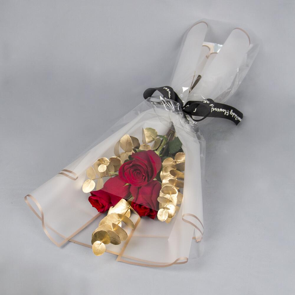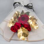Small bouquet with red Roses and gold Leaves in a elegant wrapping.