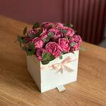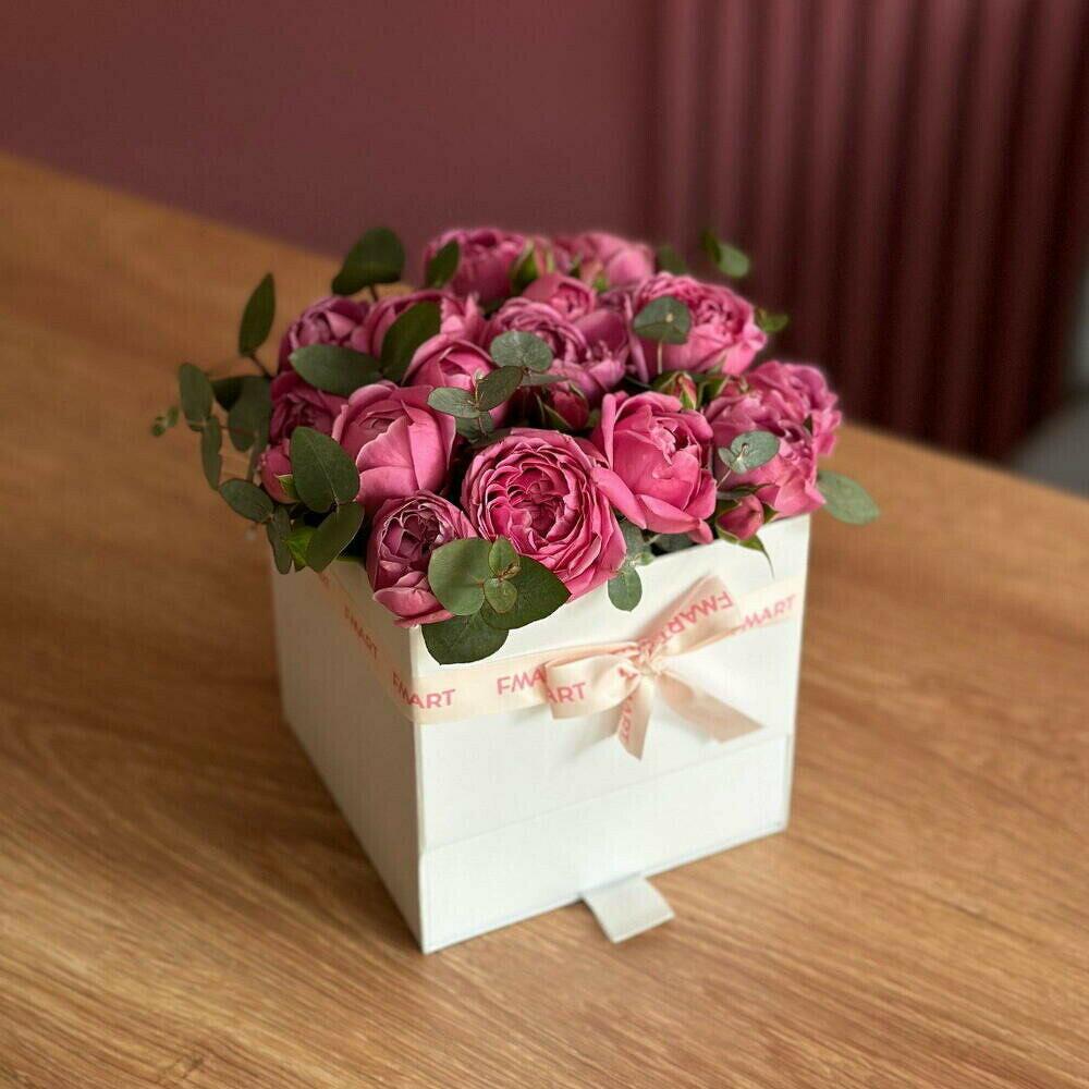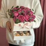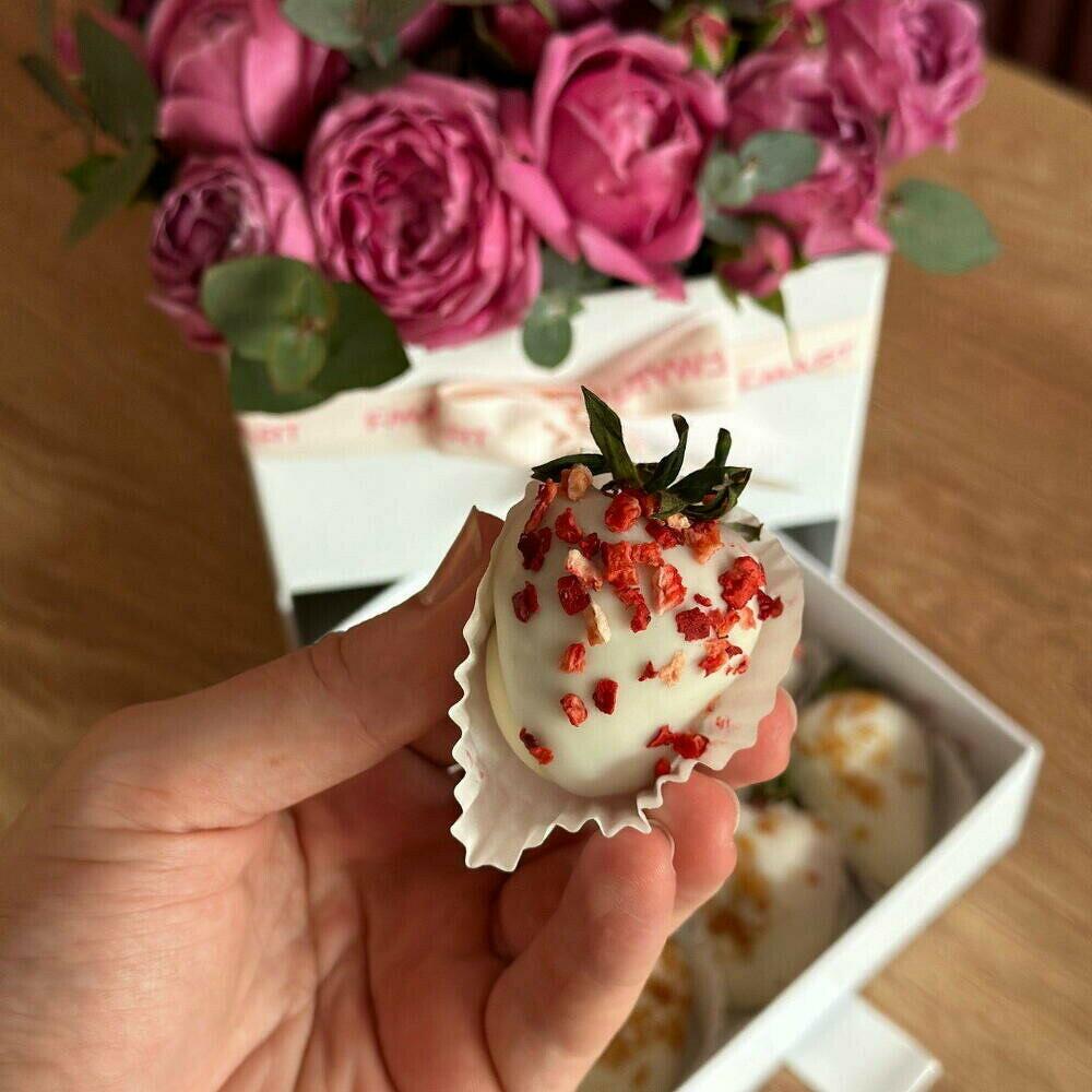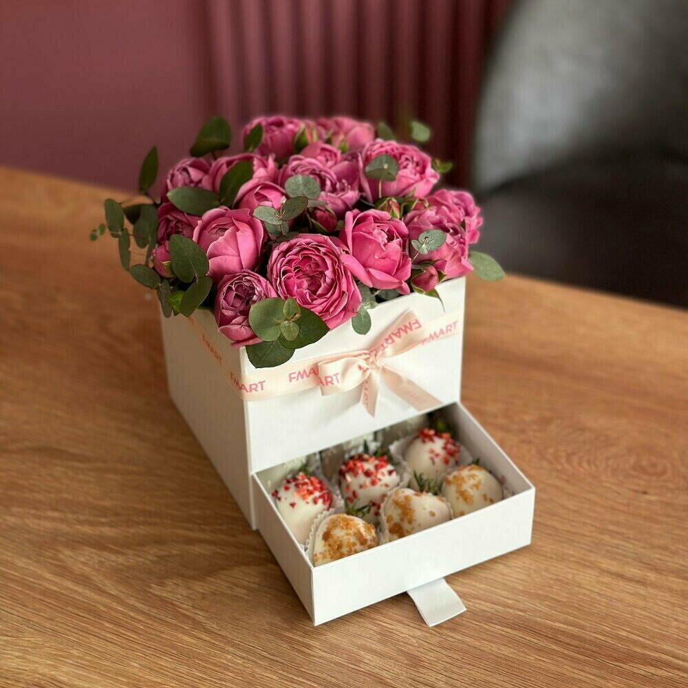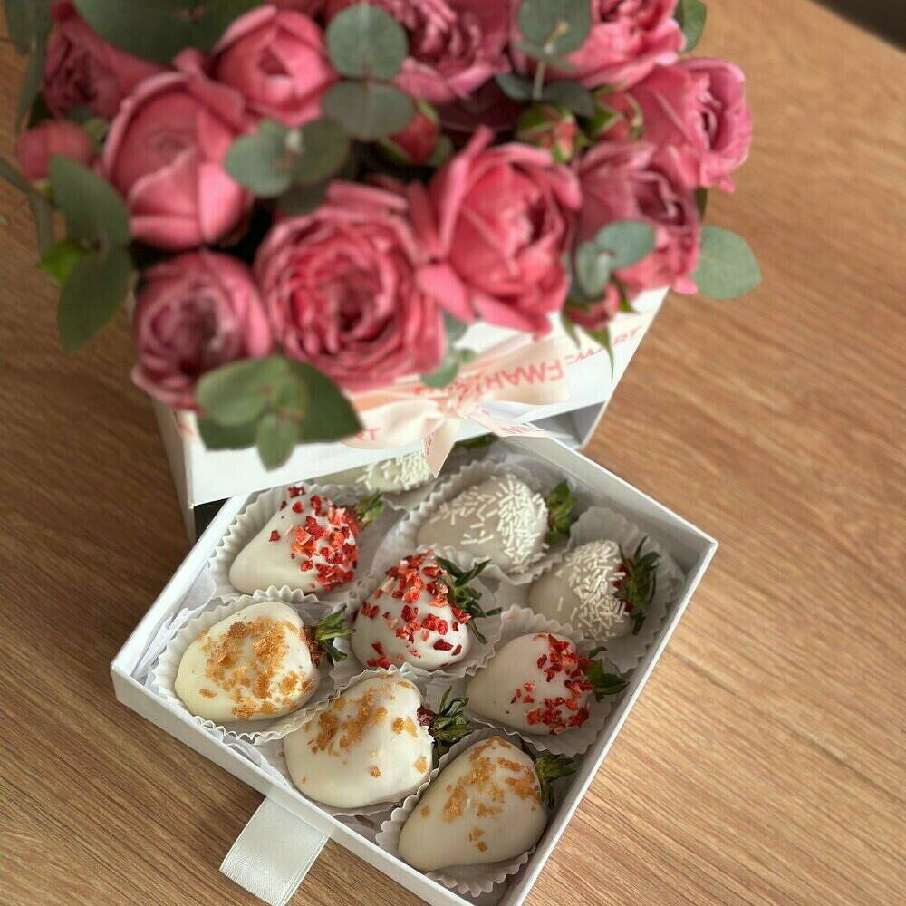 Rosa peonia - 25 pz Атласная лента - 1 pz Шкатулка - 1 pz Клубника в шоколаде - 9 pz биофлор - 1 pz