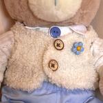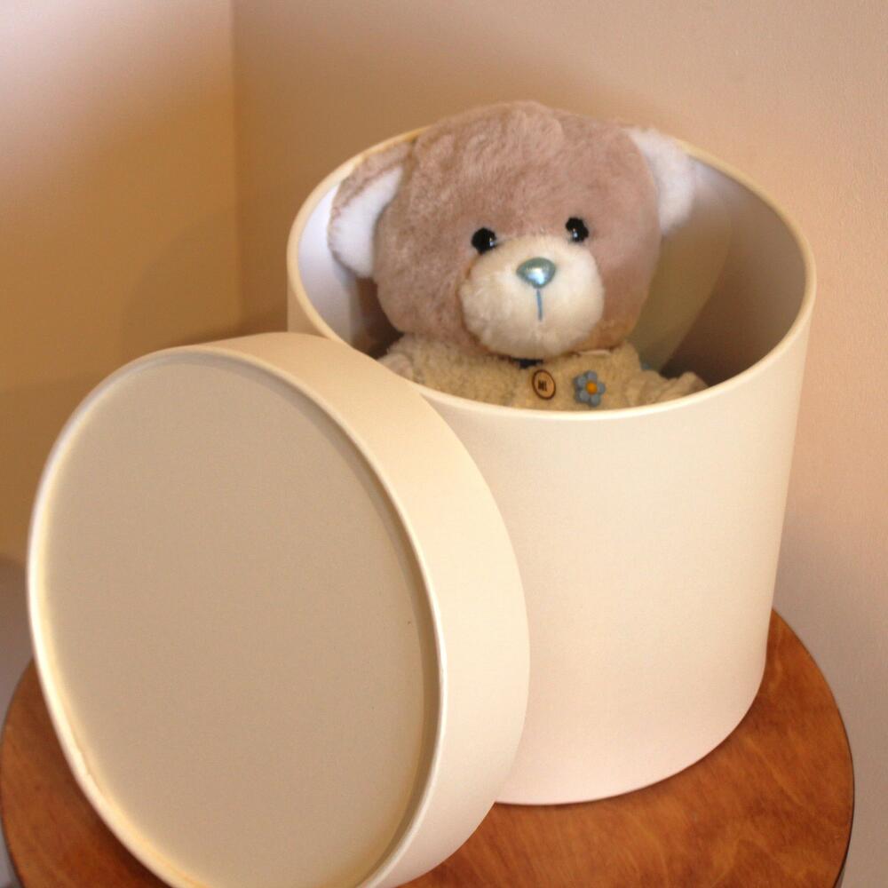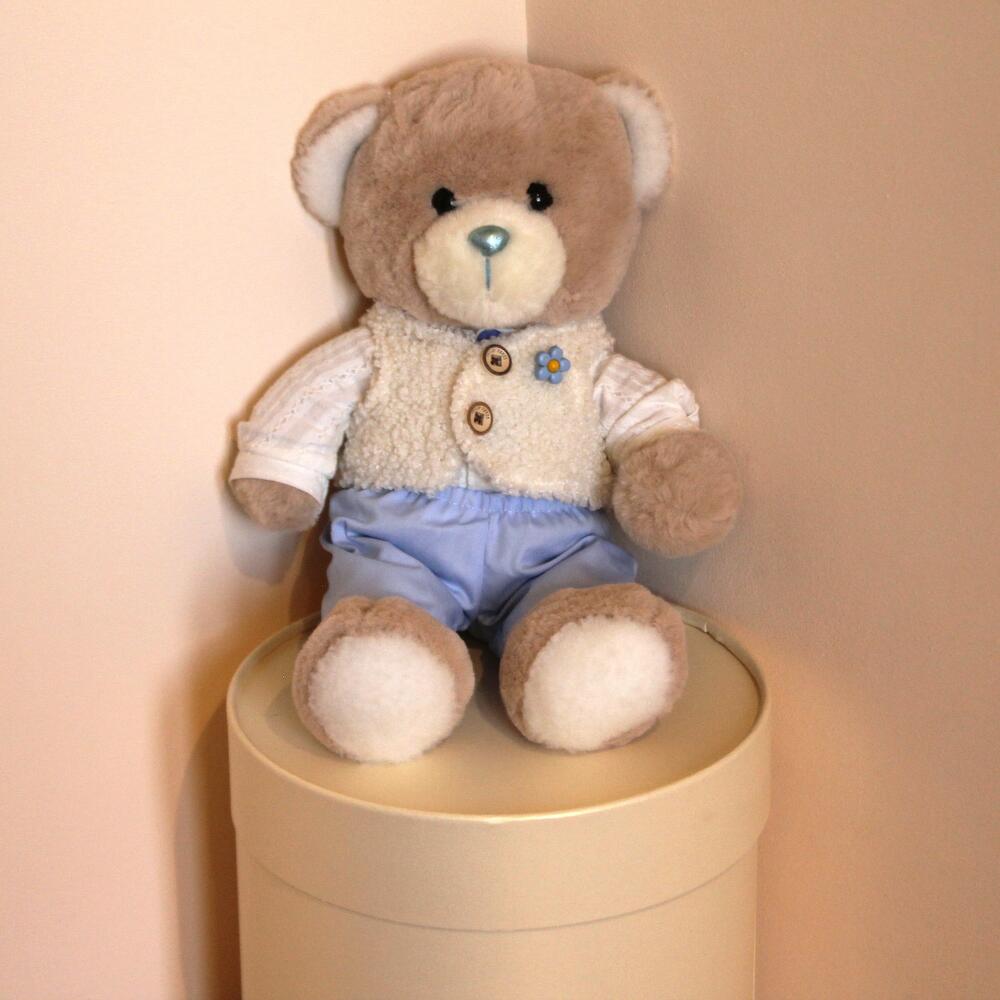 Плюшевый мишка в одежде Шляпная коробка перламутровая Бумага тишью голубая Бантик на коробку