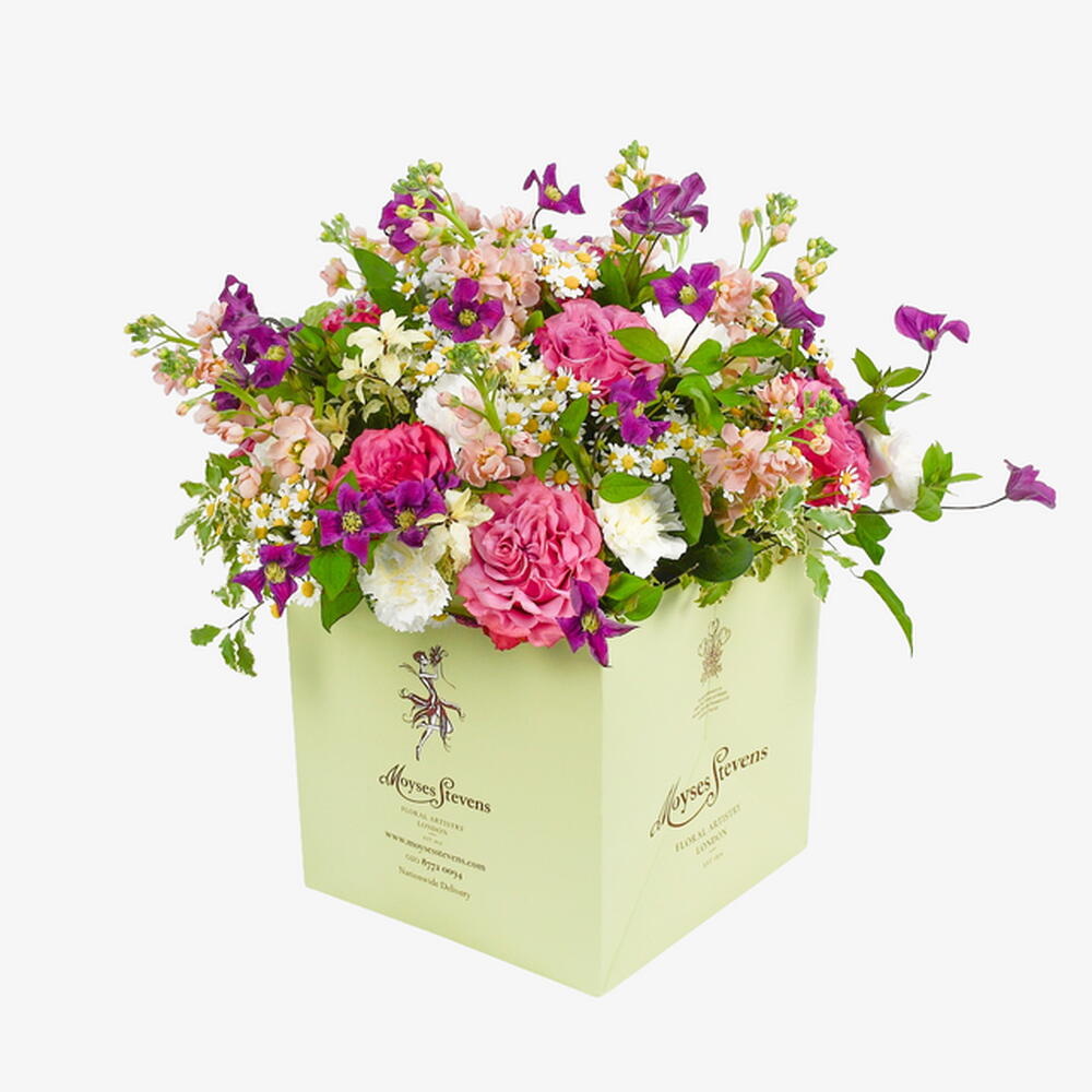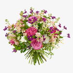 A bouquet that calls to mind summer days and clear blue skies. Its evocative and redolent, a design which transports the viewer and brings into focus the magnificent power of flowers. With fresh daisies and pale pink roses, our favourite carnations and strong stems of alstroemeria, its an explosion of colour to rival any fireworks display.