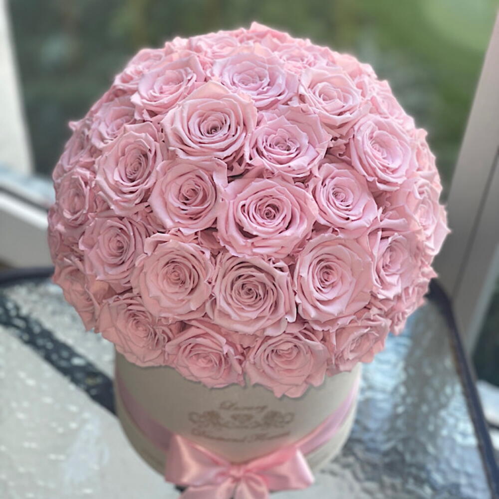 Up to 50 preserved roses Dome design in round linen box will last years. Please mention in notes roses color. Available : red roses, pink roses, white roses, dark blue roses, peach roses, yellow roses