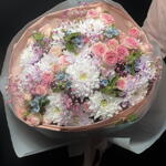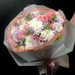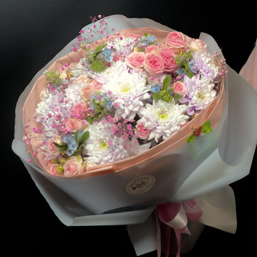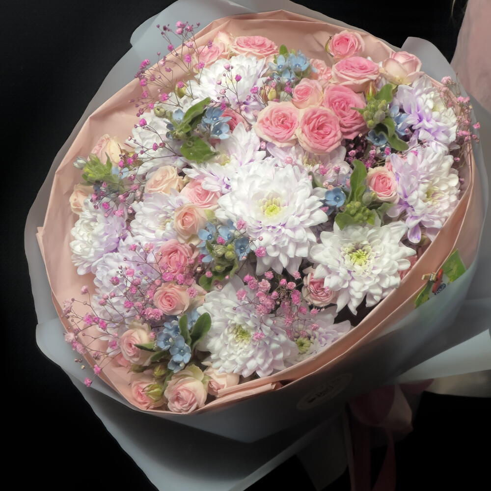 Crisantemo - 4 pz gipsofila - 3 pz oxypetalum - 7 pz spray di rose - 5 pz