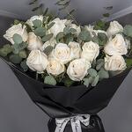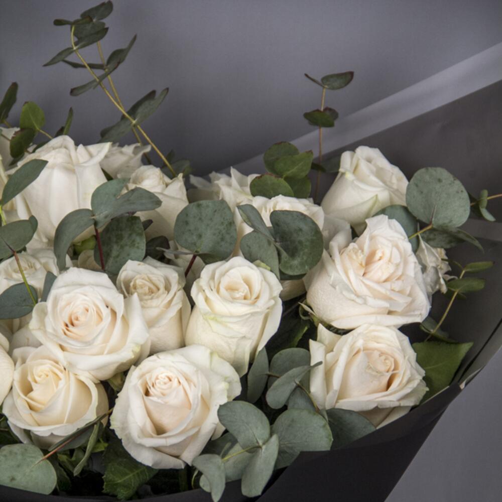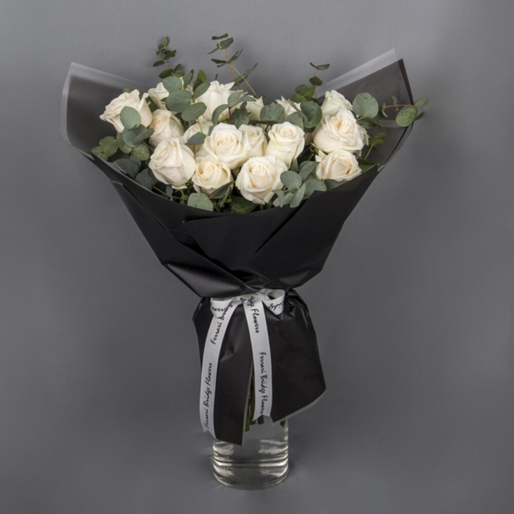 An elegant bouquet with white Roses and Eucalyptus, wrapped in black paper and white ribbon.