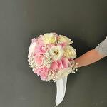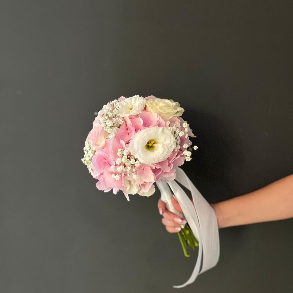 This luxurious bridal bouquet is composed of the softest and most delicate flowers. Hydrangea, rose and gypsophila will bring a romantic mood to this unforgettable day. Note: The design of the bouquet can be changed to a similar one if the required material is not available