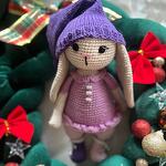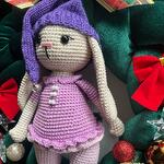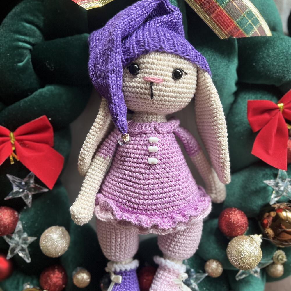 A knitted bunny in a hat. The hat is removed. When ordering, you can make changes to the color of clothes
