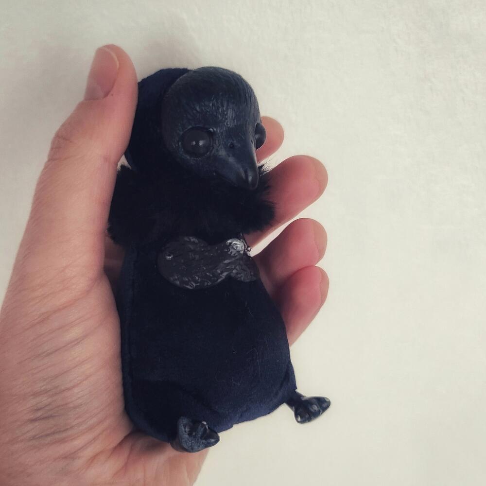 Interior crow, made of fur and polymer clay. Wings move. Do not wash, wipe off dirt with a damp cloth without alcohol