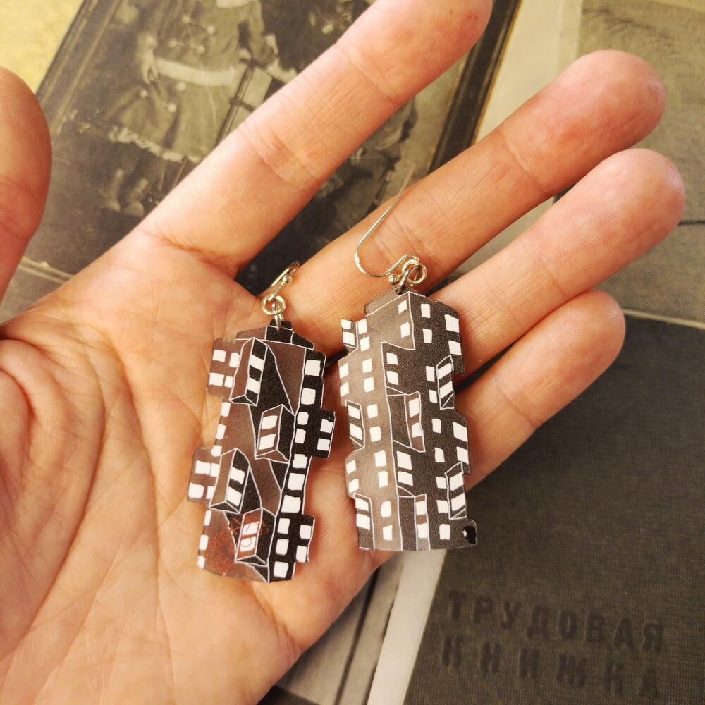 Grey and white earrings inspired by the iconic architecture of Belgrade in the form of a house. Size of each 22x44 mm, earhook material stainless steel