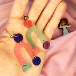 Geometric style half transparent earrings with waterproof print. Size of each 32x60 mm, earhook material is stainless steel