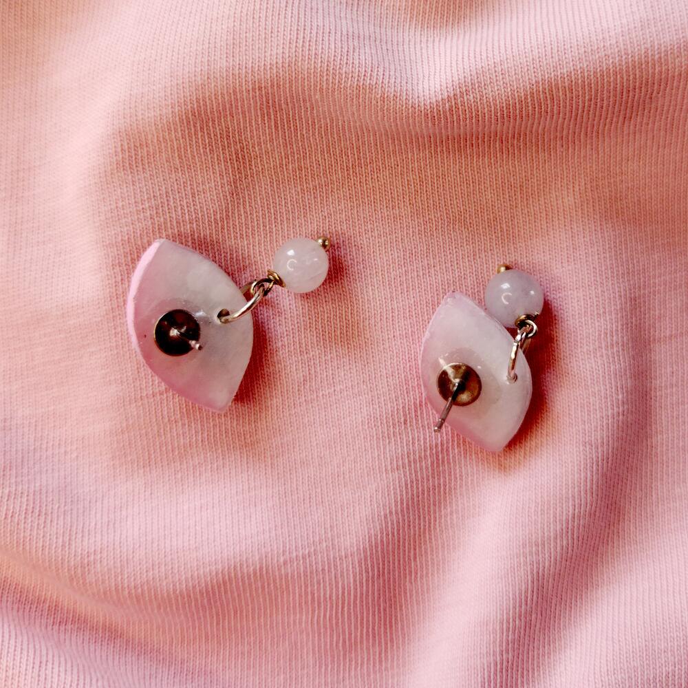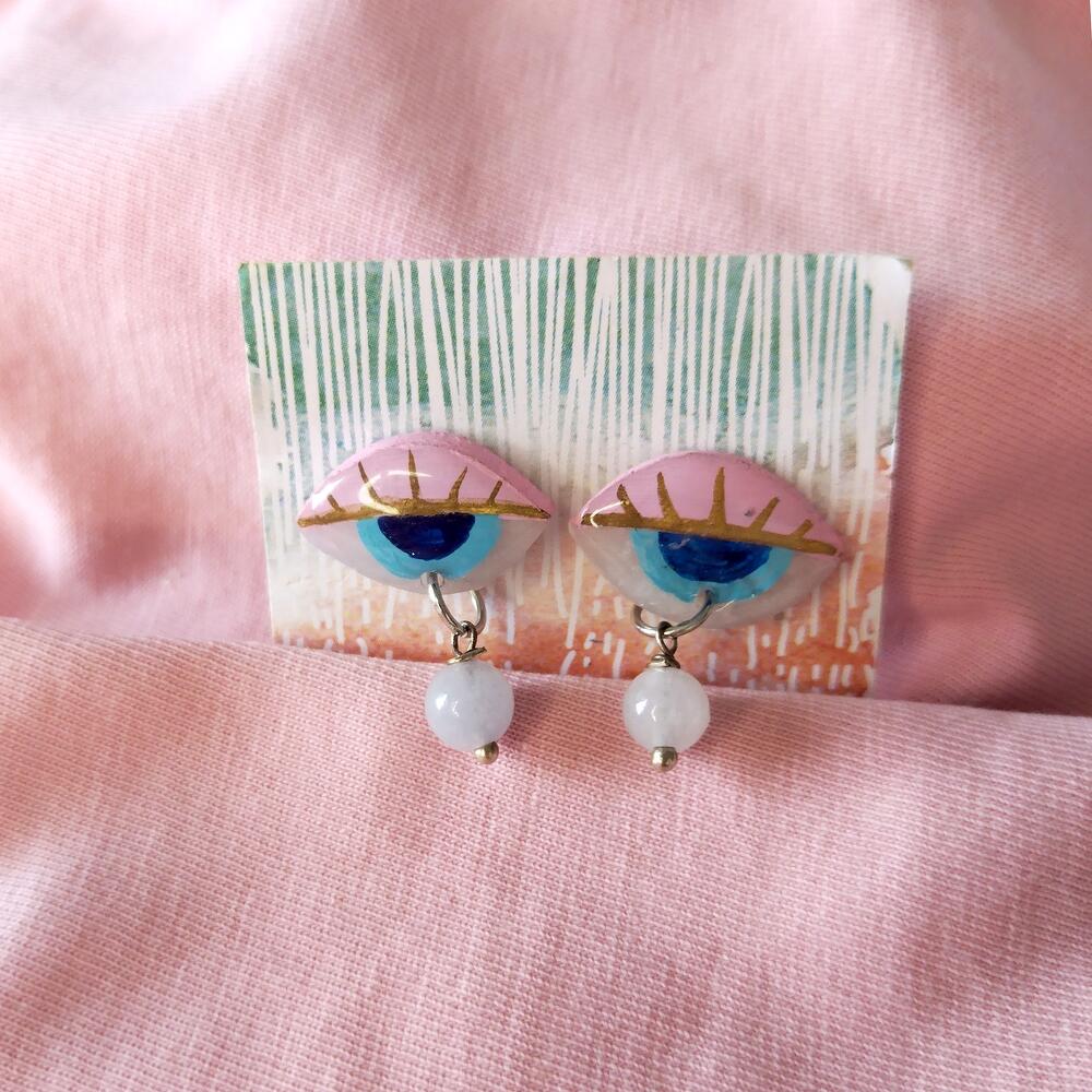 Handmade studs earrings in shape of blue and pink colors eyes with aquamarine beads . Made of polymer clay, hand painted and covered with epoxy resin.