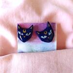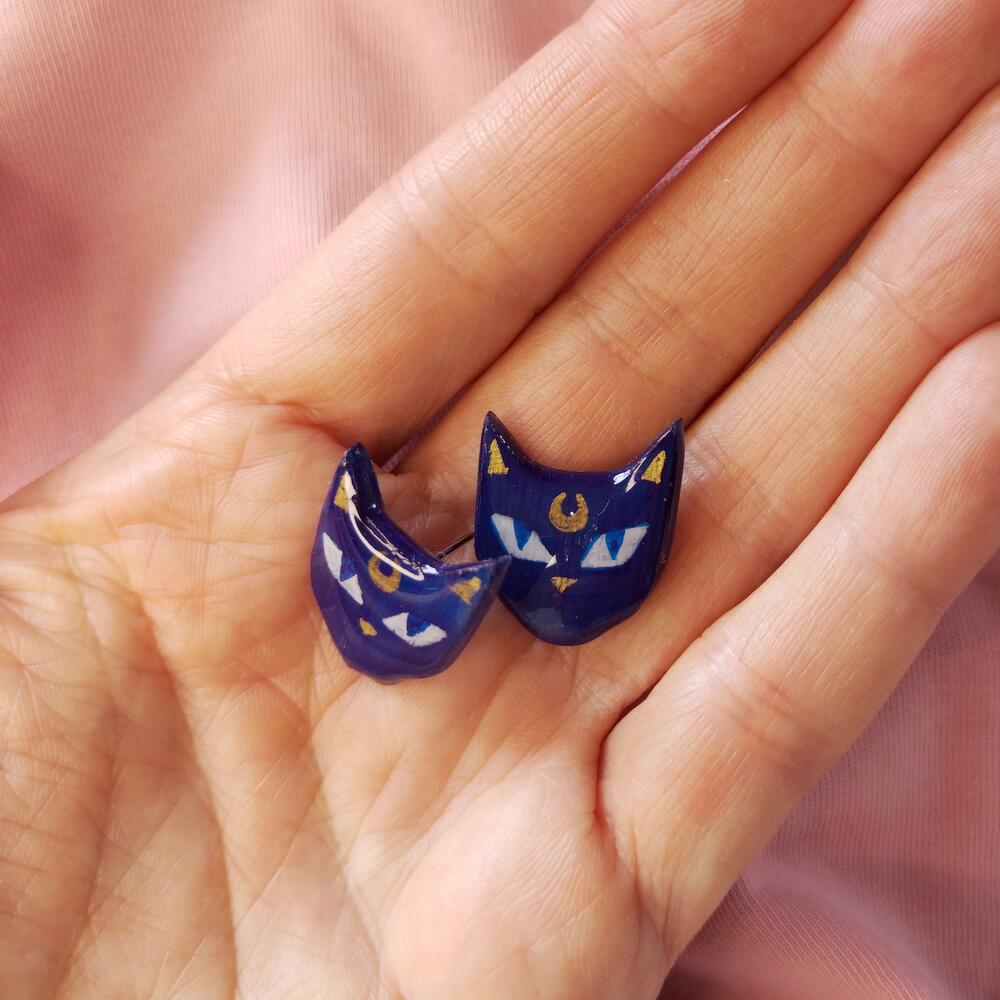 Handmade studs earrings in shape of dark blue cat with gold moon on forehead. Made of polymer clay, hand painted and covered with epoxy resin.